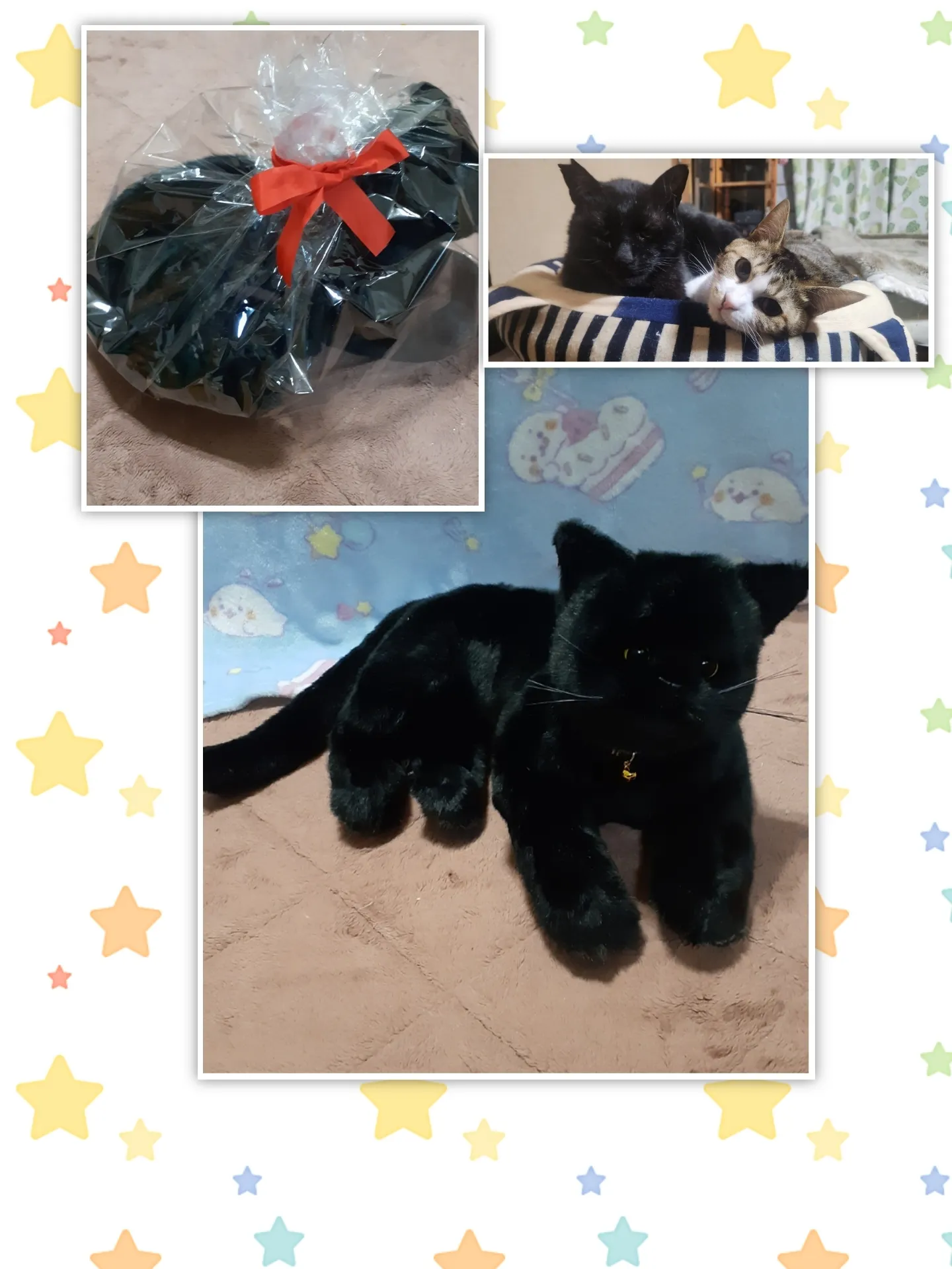 可愛い黒猫のぬいぐるみが届きました。お空に帰った福丸くんに似てますね。♥いつもべったり寄り添って仲良くしていたなるちゃんが寂しくないようにとお送りくださいました。(涙)