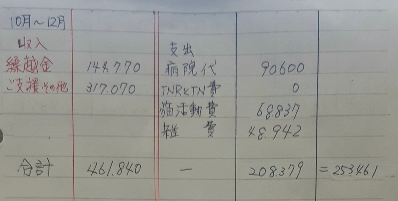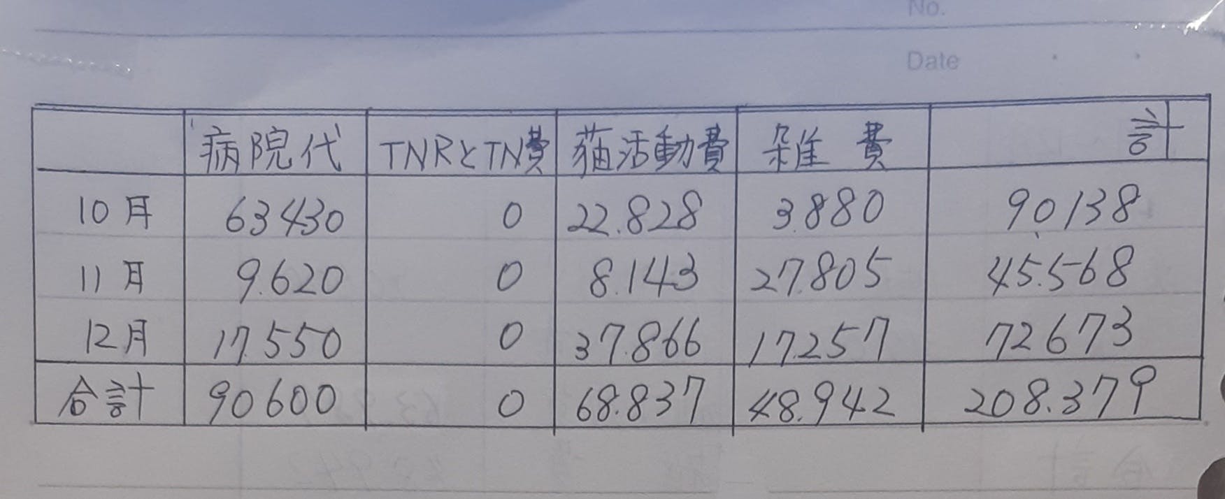 病院代、またTNR費用につきましては領収書の掲載を報告時に致しておりますので再度の掲載は割愛させて頂きます。