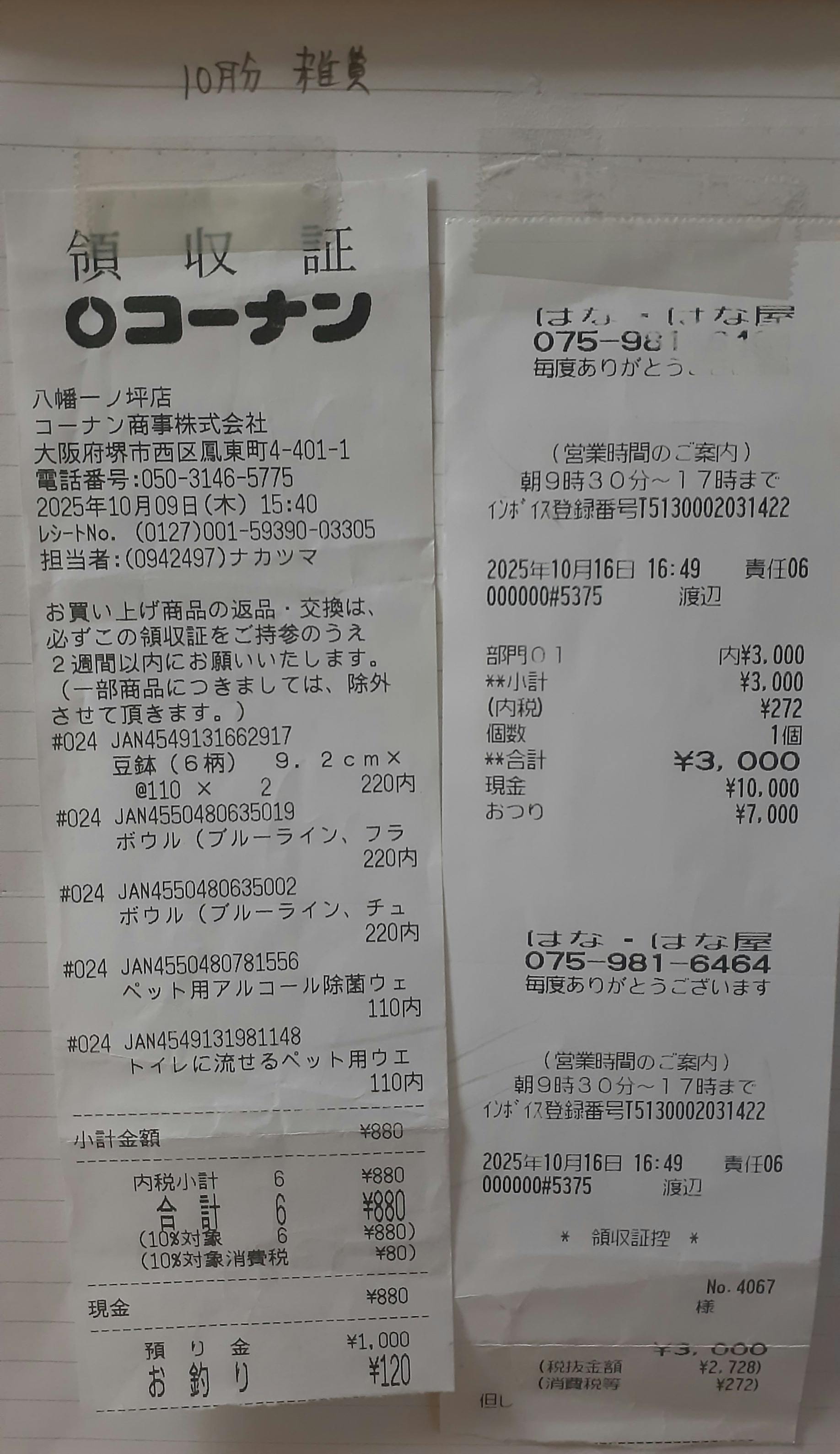 10月16日お供えお花代3,000円(ボラさん飼い猫)