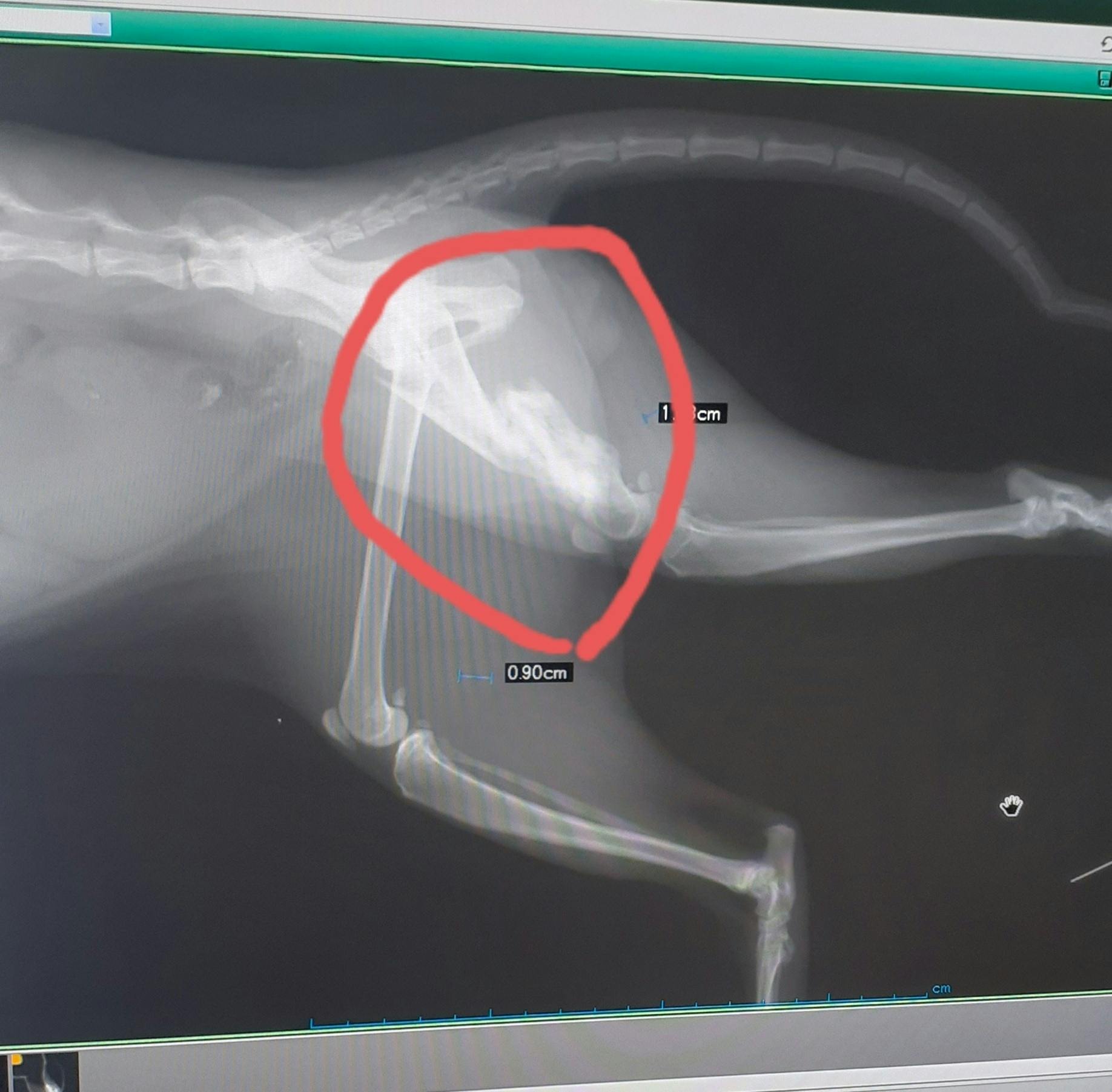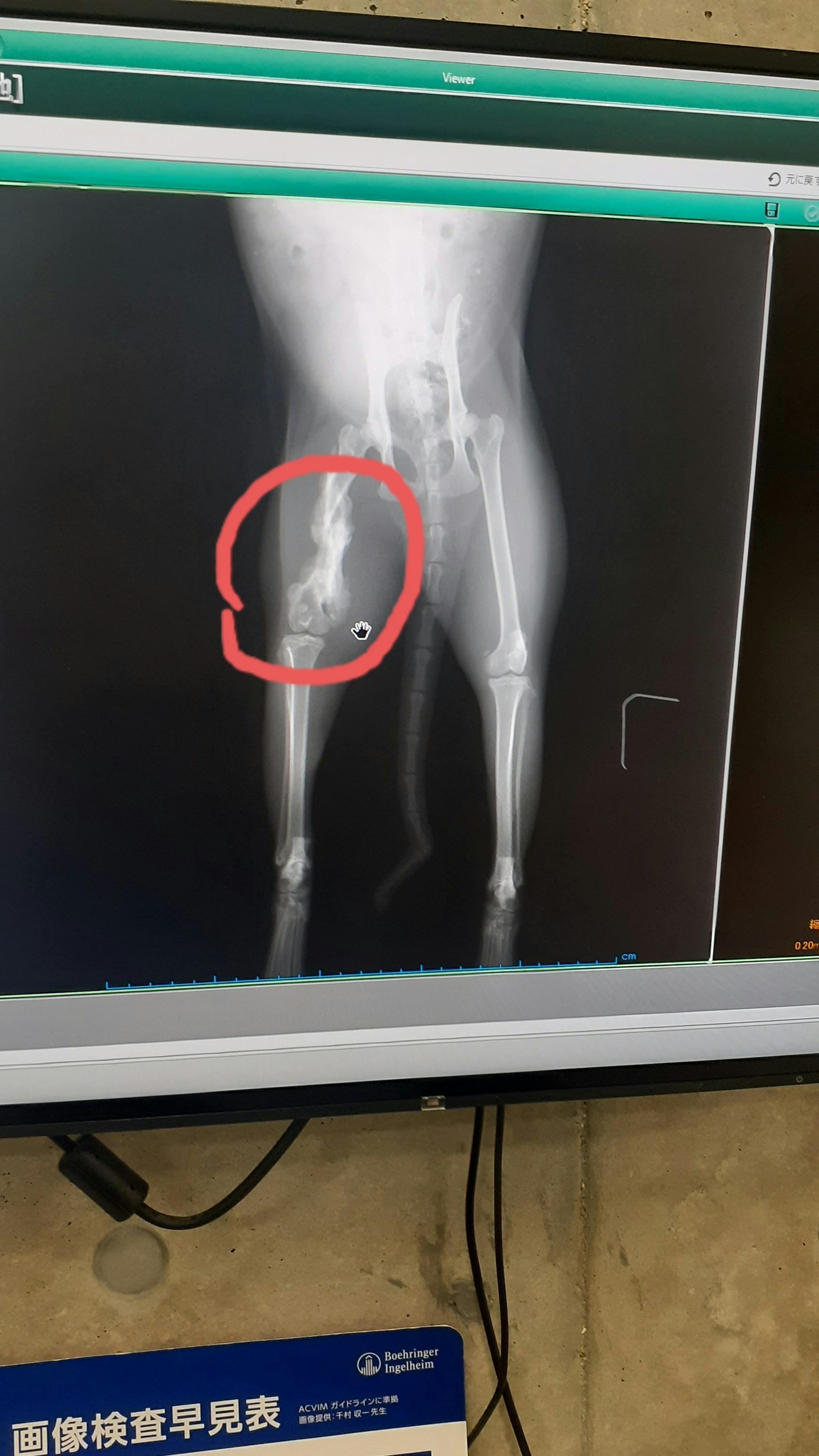 右脚上部に二ヶ所骨折の後が見付かり、そのずれた骨の周りにモジャモジャとしたまた骨らしきものが写りました。高齢だったら骨の腫瘍を疑うところだが