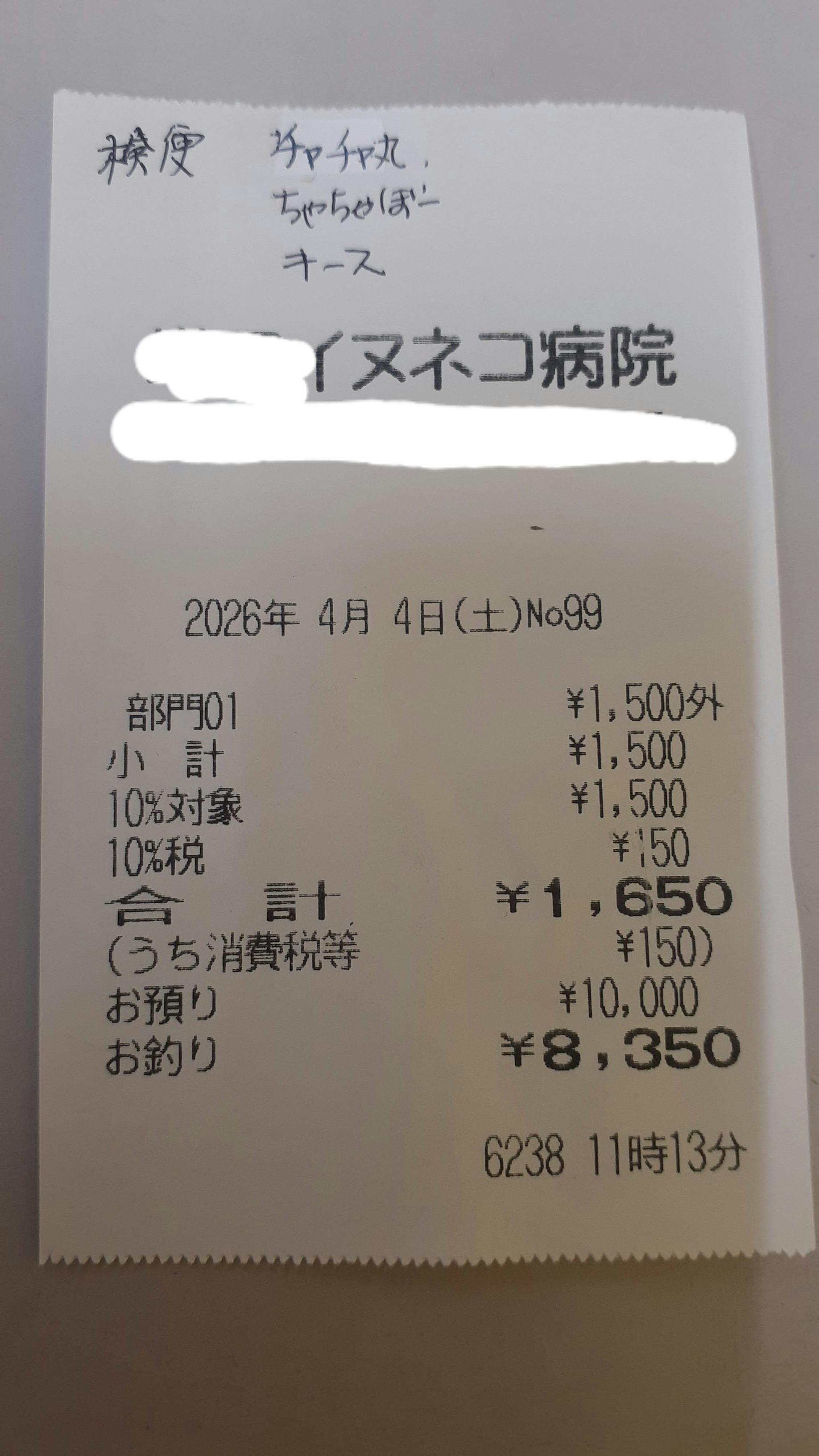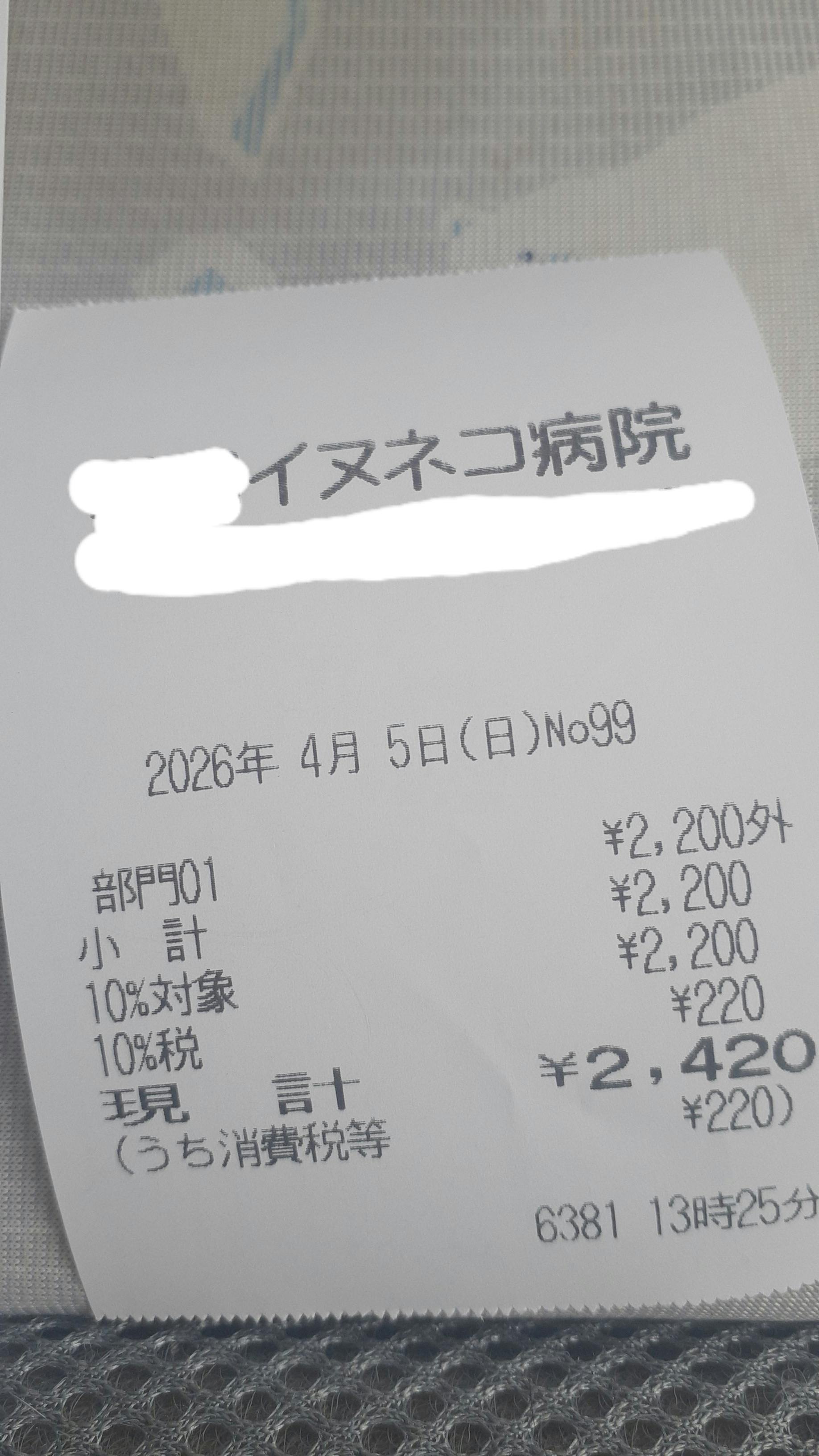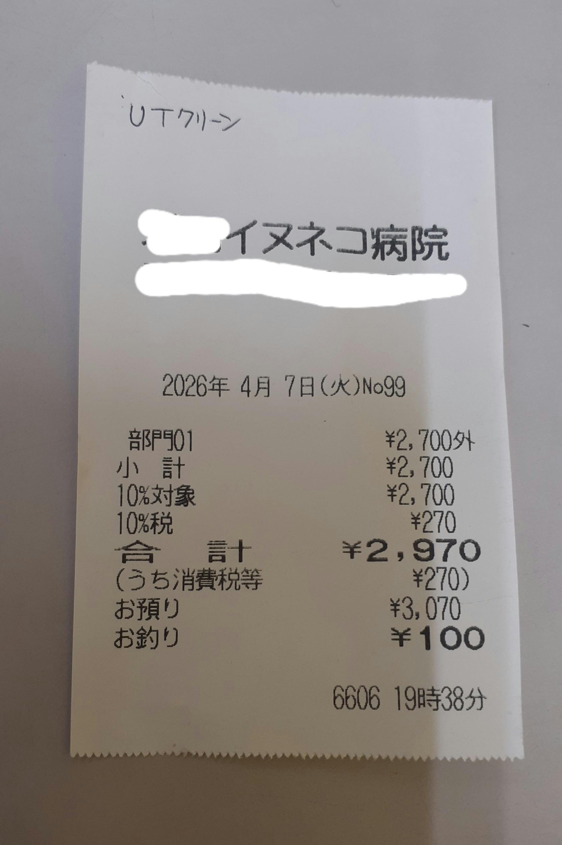 うんちの検査をしたところ、マンソン裂頭条虫が見つかり、駆虫薬をもらいました。2,420円でした。
