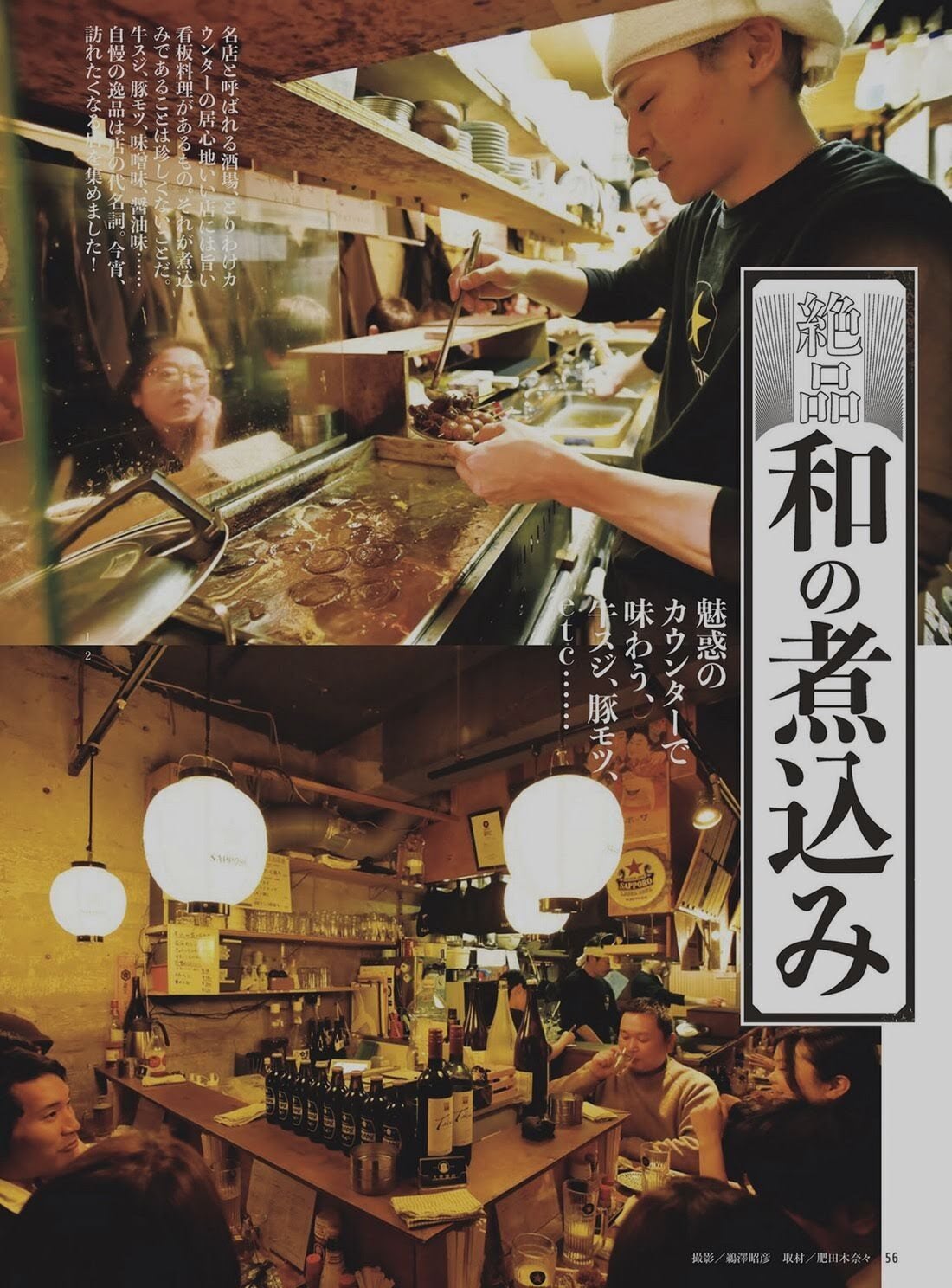 名物は開店以来、毎日継ぎ足しの煮汁で作る黒く光った豆腐と大根の煮込み。朝取れのモツの肉刺しです。コの字カウンター20席の小さなお店です。