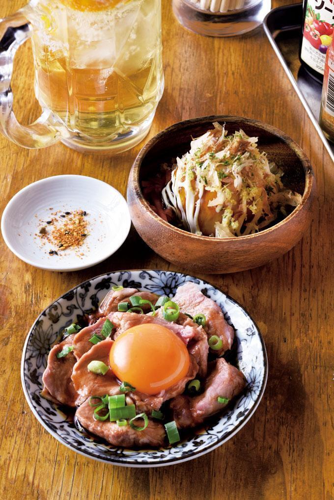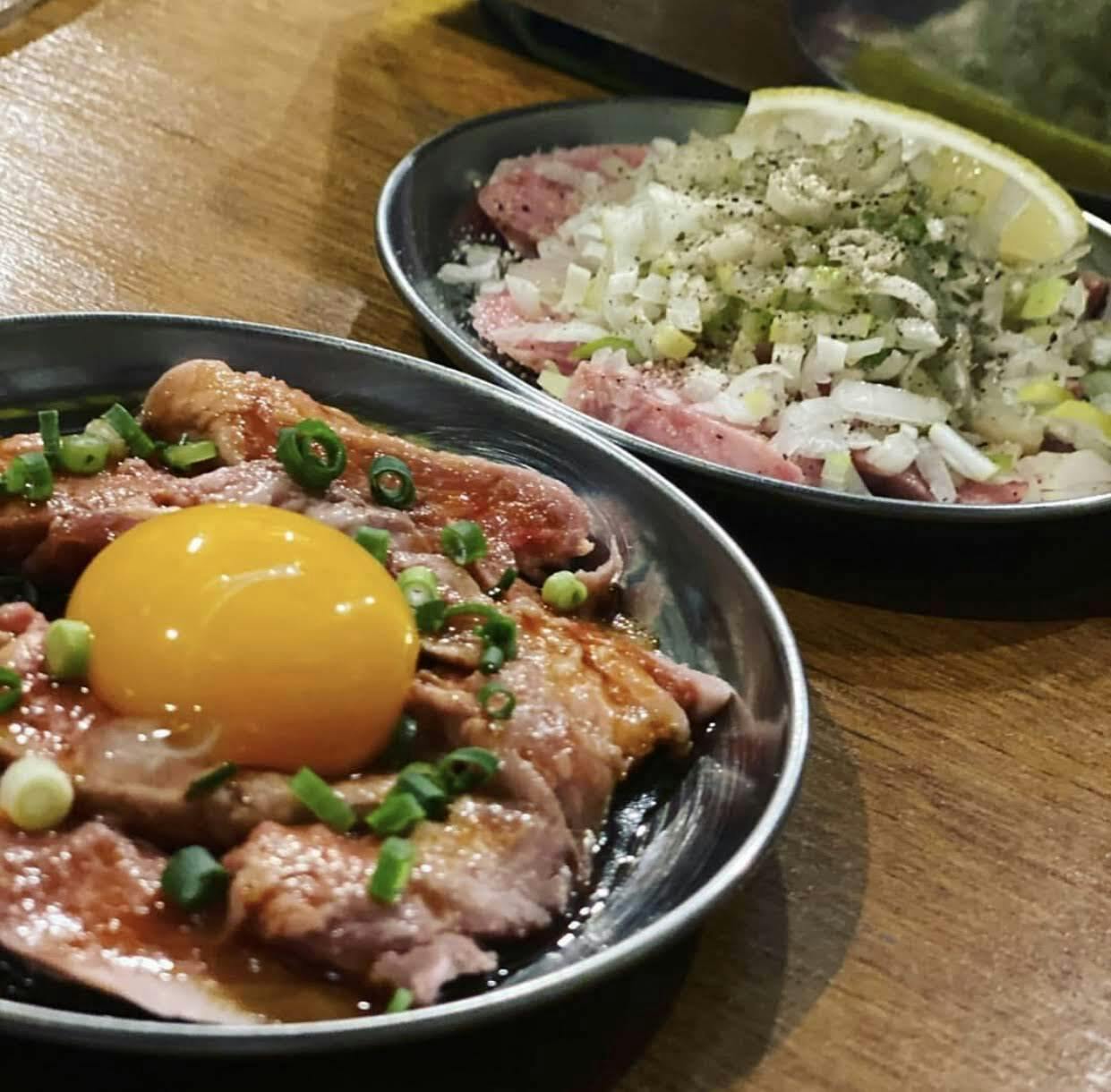 タン刺し、ハラミユッケ。新鮮なホルモンを独自の温度と時間で低温調理しています。