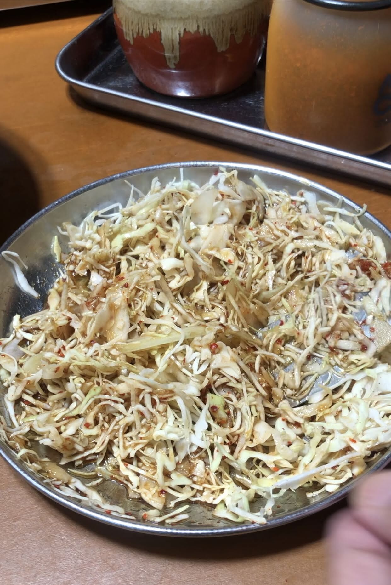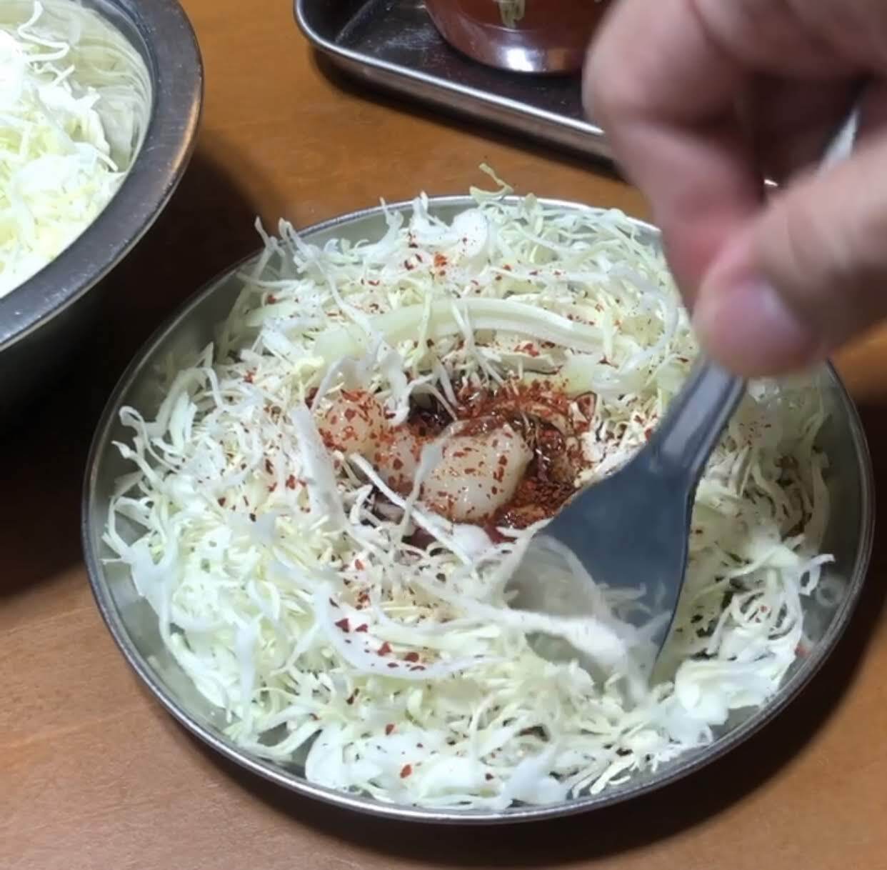 ヘラでザクザク潰して、こんな感じにしてお肉と絡めて食べて頂きます!これが何とお替り自由!