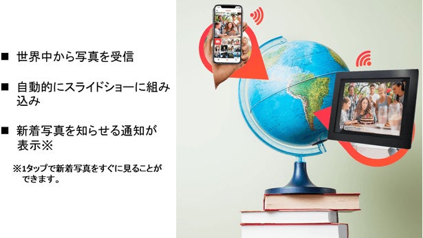 写真は自動的に受信してスライドショーに組み込まれます。必要な機能に絞っているので機械音痴のおじいちゃん、おばあちゃんでも安心!