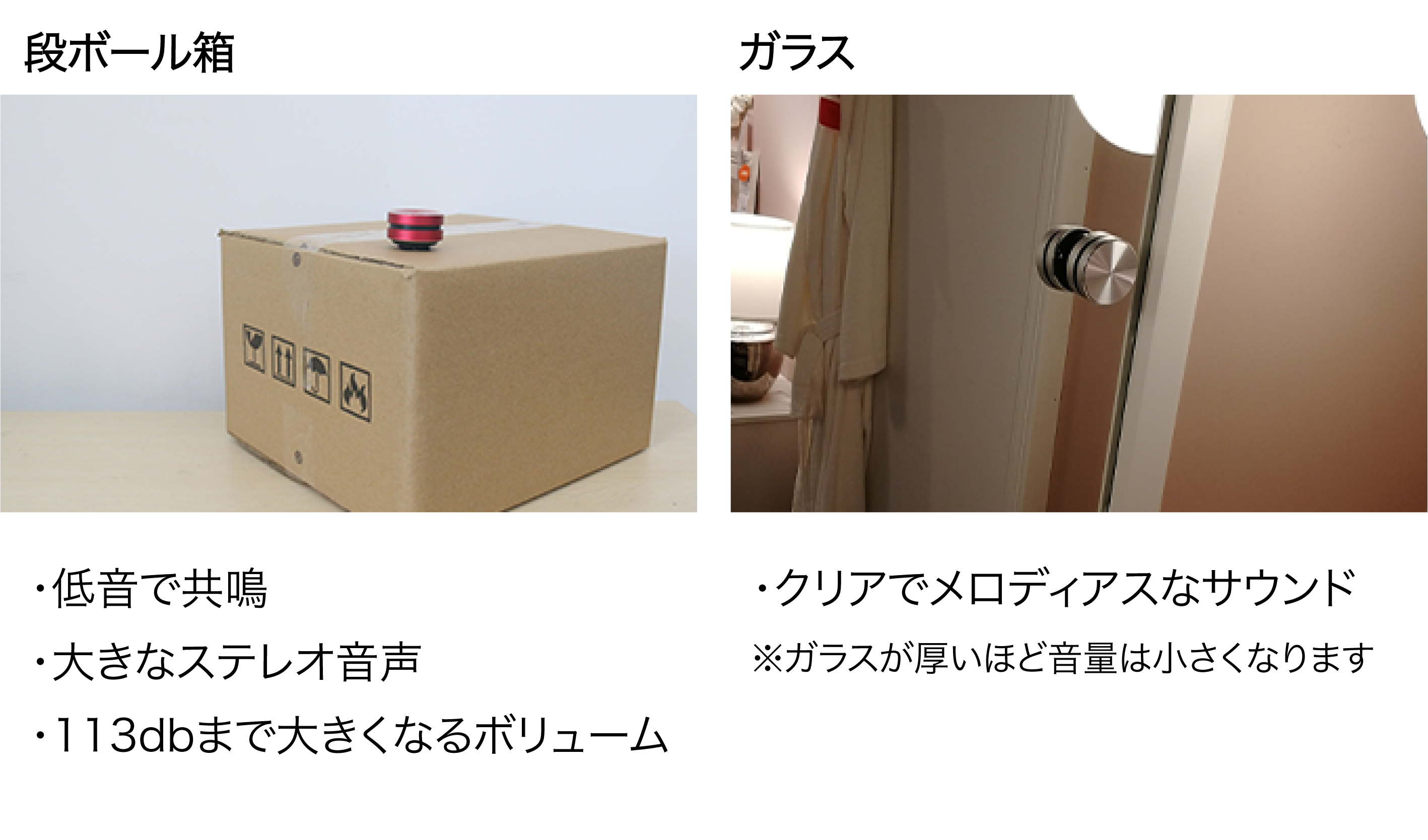 ・ダンボールだと大きな音、鏡やガラスではクリアな音、木材や車のダッシュボードでは重低音で迫力のある音!