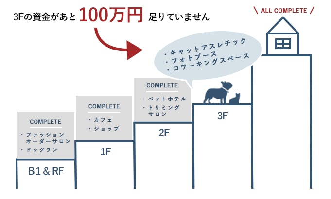 2階分の内装費用はなんとか捻出することができ、さらに資金を集めて屋上の費用もなんとかなりましたが、愛犬・愛猫と飼い主のためのこだわりを詰め込んだ3階の内装費用の一部100万円をクラウドファンディングを通じて支援をいただき完成させたいと思い、この度プロジェクトを立ち上げました。