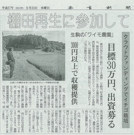 こんばんは。まだ9月下旬だというのに法隆寺の裏山にある棚田はすっかり秋めいて参りました。キャンプファイアーご閲覧の皆様、ご支援をいただきましたパトロンの皆様、いかがお過ごしでしょうか?さて「棚田完熟いちご」プロジェクトも公開終了から約2週間経ちました。来年、美味しい苺を食べてもらいたくて、松本は虎視眈々と準備を行っております。ぜひ楽しみにしてくださいね。今回は奈良新聞社様に掲載された事をご報告させていただきます。ワイモ農園の活動が地元の新聞社様に取り上げられるのは誠に光栄です(涙)今後も棚田を保全し、美味しい作物を作り、皆様に自然に触れ合っていただける様尽力してまいります!どうぞよろしくお願いいたします!
