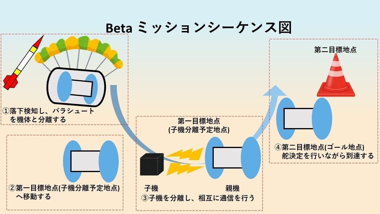 このベータプロジェクトでは、従来の投下試験に新しくひとつのミッションを設けています。それが「子機の分離・通信」です。(下図参照)