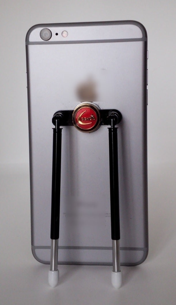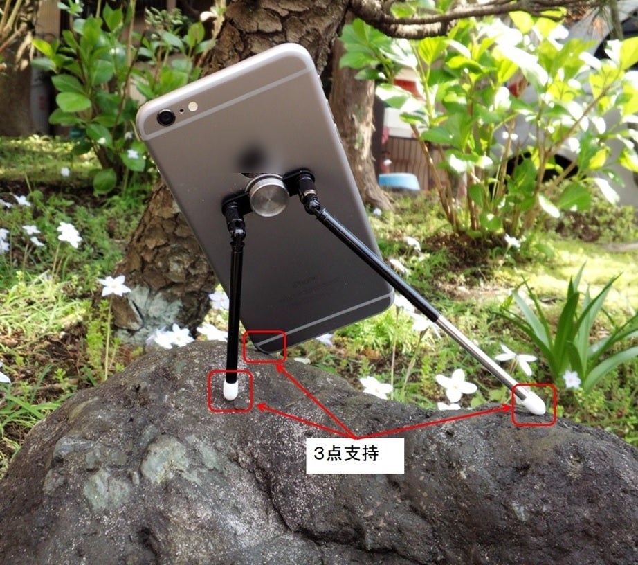 DOKO’Sは二脚ですがスマートフォンに装着して使用するため、スマートフォンの接地点と、二脚の接地点とで三点支持になります。
