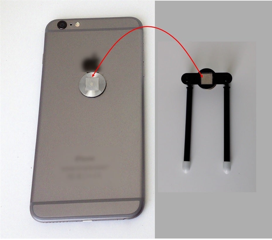 2) スマホ側結合部材の装着位置をスマホ背面の高さの3分の1くらいの所、左右は中央に決め、汚れを綺麗に拭き取ります。(スマホ本体に直接装着したくない場合は、スマホケースを利用されても可)