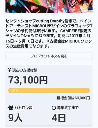 目標達成後も、コツコツとご支援頂いてます。有り難うございます。Tシャツのサイズ、そしてTシャツ自体の色も気になる方が多いと思います。画像や文字だけで、ご予約頂けた事、とっても嬉しいです。着用画像は色々な体型の方に着て頂こうと思っていました、画像をたくさんアップする頃に、予約期間の後半になってようやく、ご自身に似合いそうなサイズや柄が定まってくるかな〜と。…予測だけはついていたのですが、前半、やはり焦ってました(汗)そして4月〜5月にかけては、cutting Dorothyのお店に春物が入荷。また、新しく取り扱うブランドが二つもあって、その紹介やお披露目にも時間を割かねばなりません。5月は、カフェで絵の展示会の企画も。以前のタイツのよりも、少し宣伝やフォローが足りなかったかな…と、ここ終了間際に振り返って反省。そんな状況で、MICROU君や当店のお客様、僕の友人の皆様はずっと応援・宣伝をしてくださいました。本当に!!!有り難うございます!!! 最後に、MICROU君はどんどん、新しい企画に呼ばれて、スケジュールがちょこちょこ埋まって来ているみたい。SNSを見ていて、励みになるし楽しかったです。良かったね、頑張ってね!!以下は、最近のTwitterの文章です。良ければ、フォローよろしくお願いします。→MICROU(@MICROUdayo) ☆わあああほんとう!?ありがとううう(ToT)ほんとうにほんとうにありがとう。。ちなみに着用写真はカラフルがドルマンスリーブ、ボルドーが普通Sだよ!Sといっても日本製でいうとMサイズくらいかな?絵いつでも大丈夫だよ!ーーーちゃんのタイミングの良き時で☆本当に有難う! ☆応援してくださる皆様のお陰で、無事目標額達成することができました!本当、本当に有難うございます。 ☆とても嬉しいお言葉を…!そう思って頂けているなんてとても嬉しいです。本当に本当に有難うございます(T_T)ライブペイントできることを私も楽しみにしております!!そのときは是非いつでもお呼びかけくださいっ!(^o^)/ ☆予約締切間近となってきました。 CAMPFIREさんのサイトにてTシャツ限定予約販売、こちらの予約以外では販売しておりませんので是非サイトをご覧になって頂けたら嬉しいです! ☆AOC顔合わせ楽しかった!良いグループ展となりますように〜!ライブペイントも楽しみだし6月も楽しみだ ではでは、今日はこの辺で☆