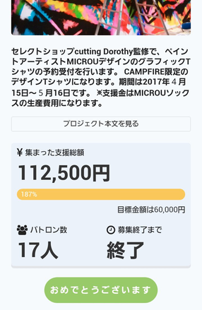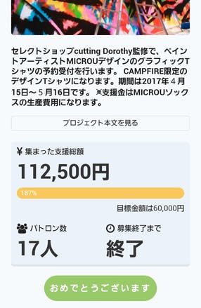 このプロジェクトは、2017/04/15に募集を開始し、 17人の支援により 112,500円の資金を集め、 2017/05/16に募集を終了しました