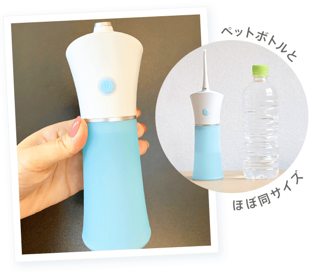 『ジェットウォッシャーMINI』の大きさはペットボトルとほぼ同サイズなので、バッグの中に入れてどこへでも持ち運べます。