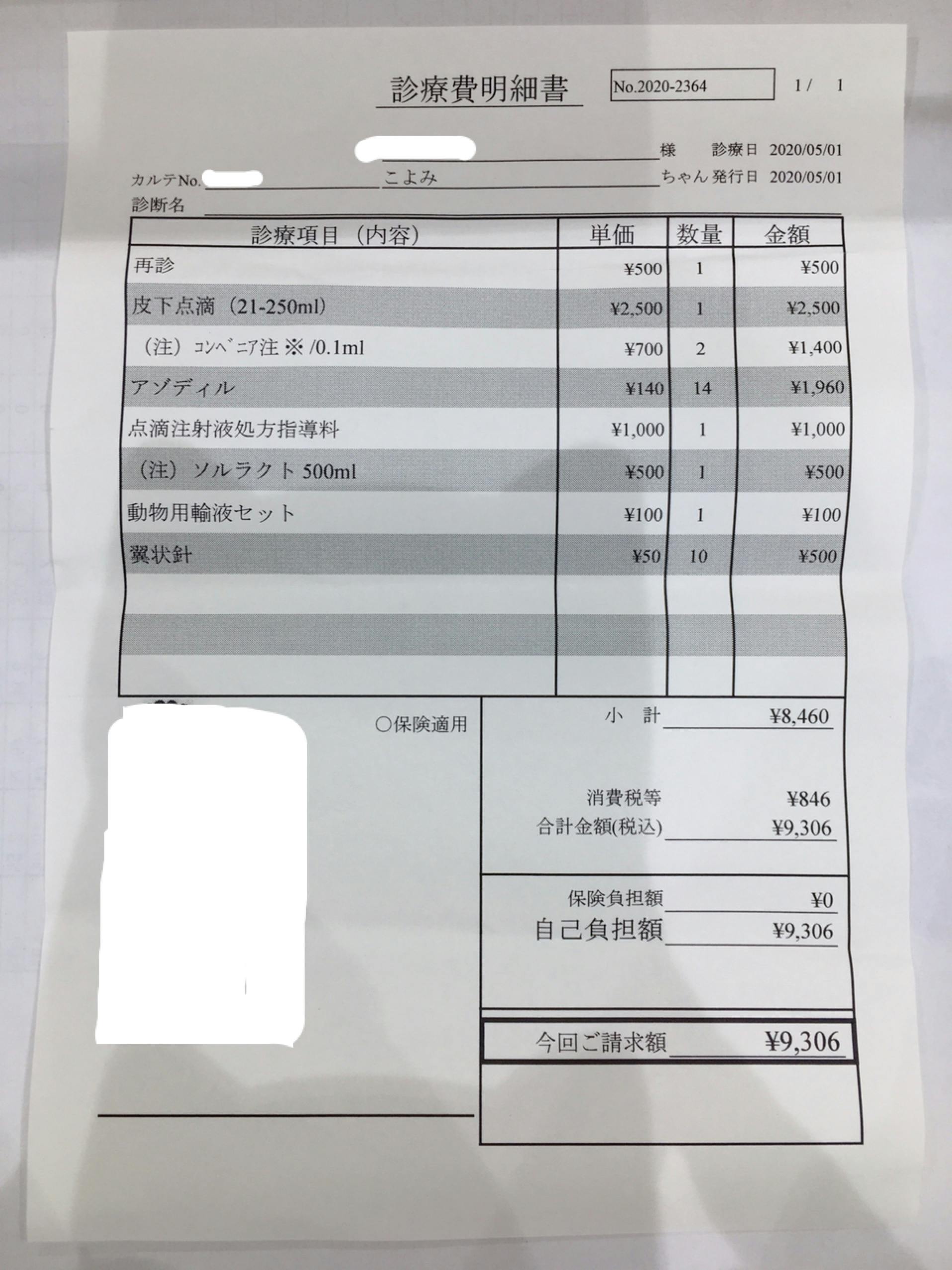 鼻水出てグシュングシュンしているので抗生剤をいれてもらい、自宅点滴ではこよみが嫌がって十分な量が入れられないこともあるので先生に点滴もお願いし、自宅点滴用のソルラクトや針、アゾディルの追加もお願いしました。