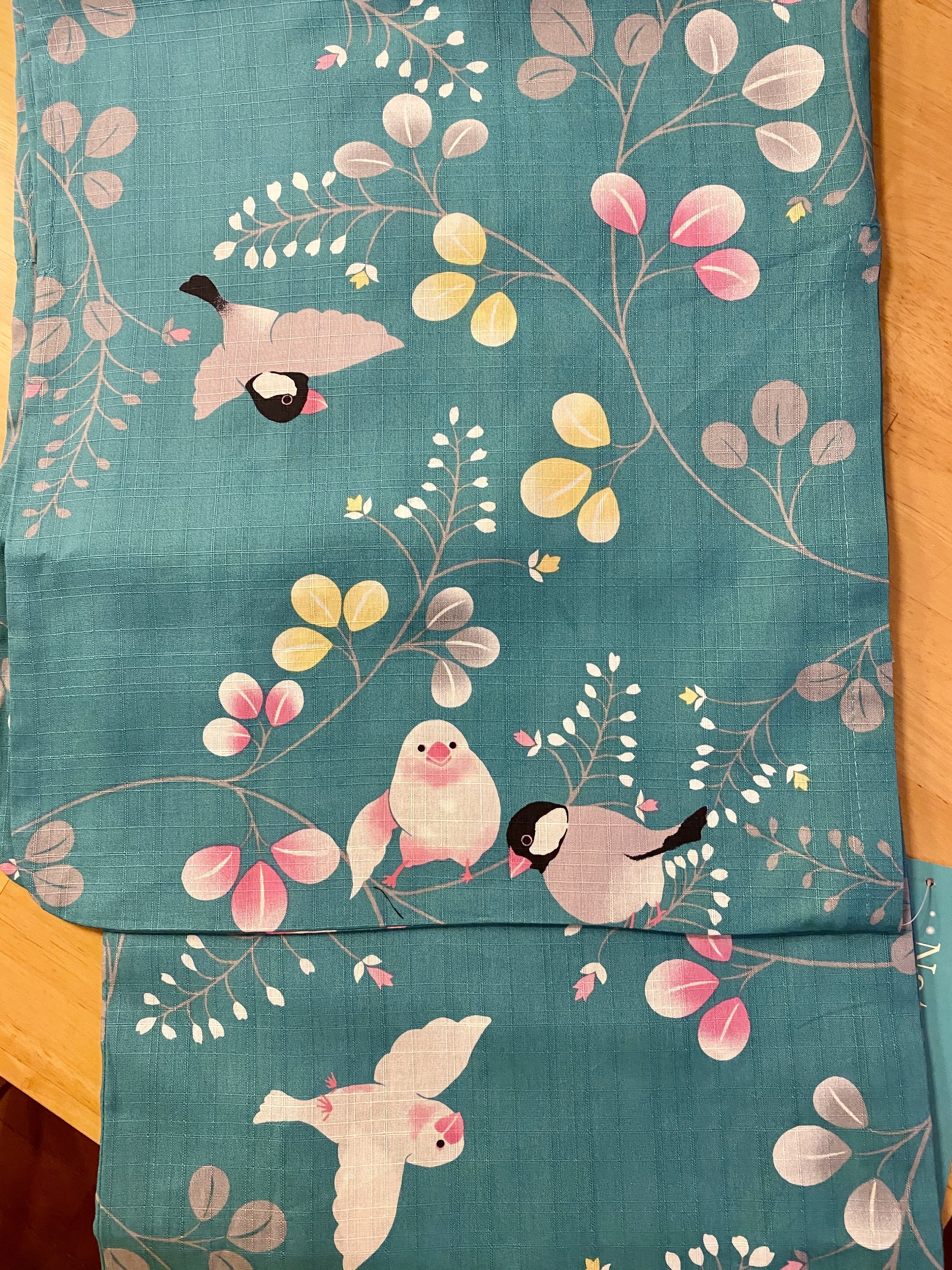 こんばんは。連投失礼いたします。文鳥浴衣のサンプルが届きました!カラーはエメラルドグリーンです。画像より実物はややターコイズ寄りの素敵なカラーです。萩モチーフと文鳥さんがとても良い感じです!
