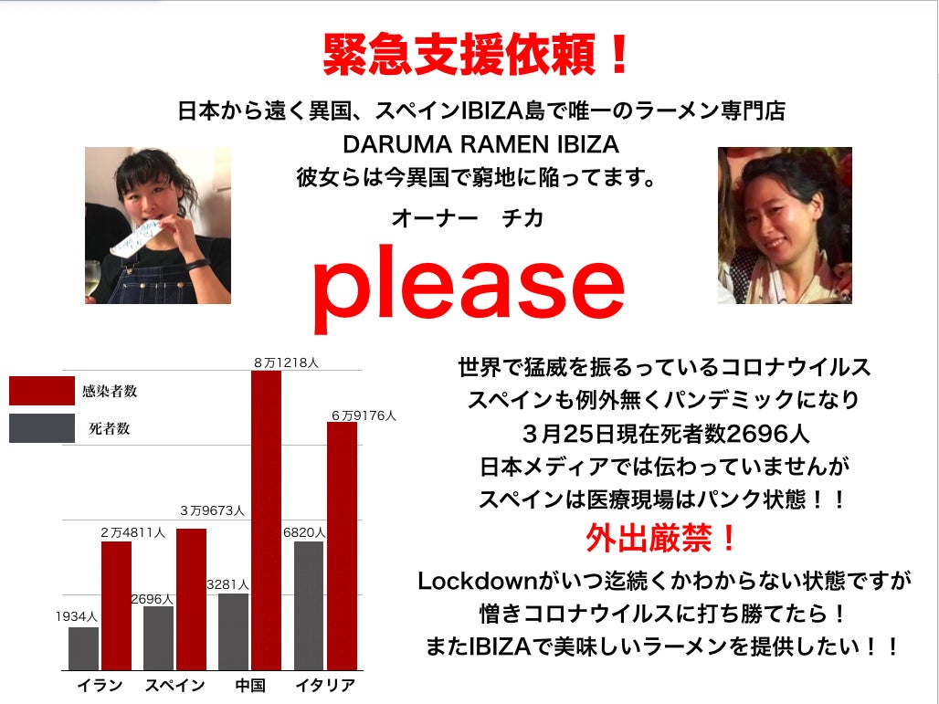 異国からのメッセージを読んで頂いた皆さま有難うございました!支援頂いた皆様、支援は見送ったけど応援してくれる皆様、コロナに打ち勝った際はIBIZAまでDARUMA RAMEN IBIZAのラーメンを是非食べに来てください♬』 by チカ
