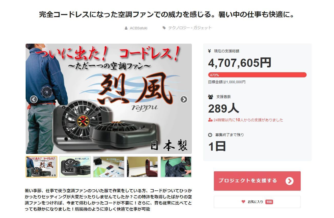 2020/07/16 22:28クラウドファンディング、無事に終了しました!結果はなんと・・・第二目標の500万達成!!支援台数は合計516台です!!何度も繰り返しますが、これも全て皆様のあたたかいご支援のおかげでございます!感謝してもしきれません!本当にありがとうございました!これからも烈風をよろしくおねがいします! もっと見る