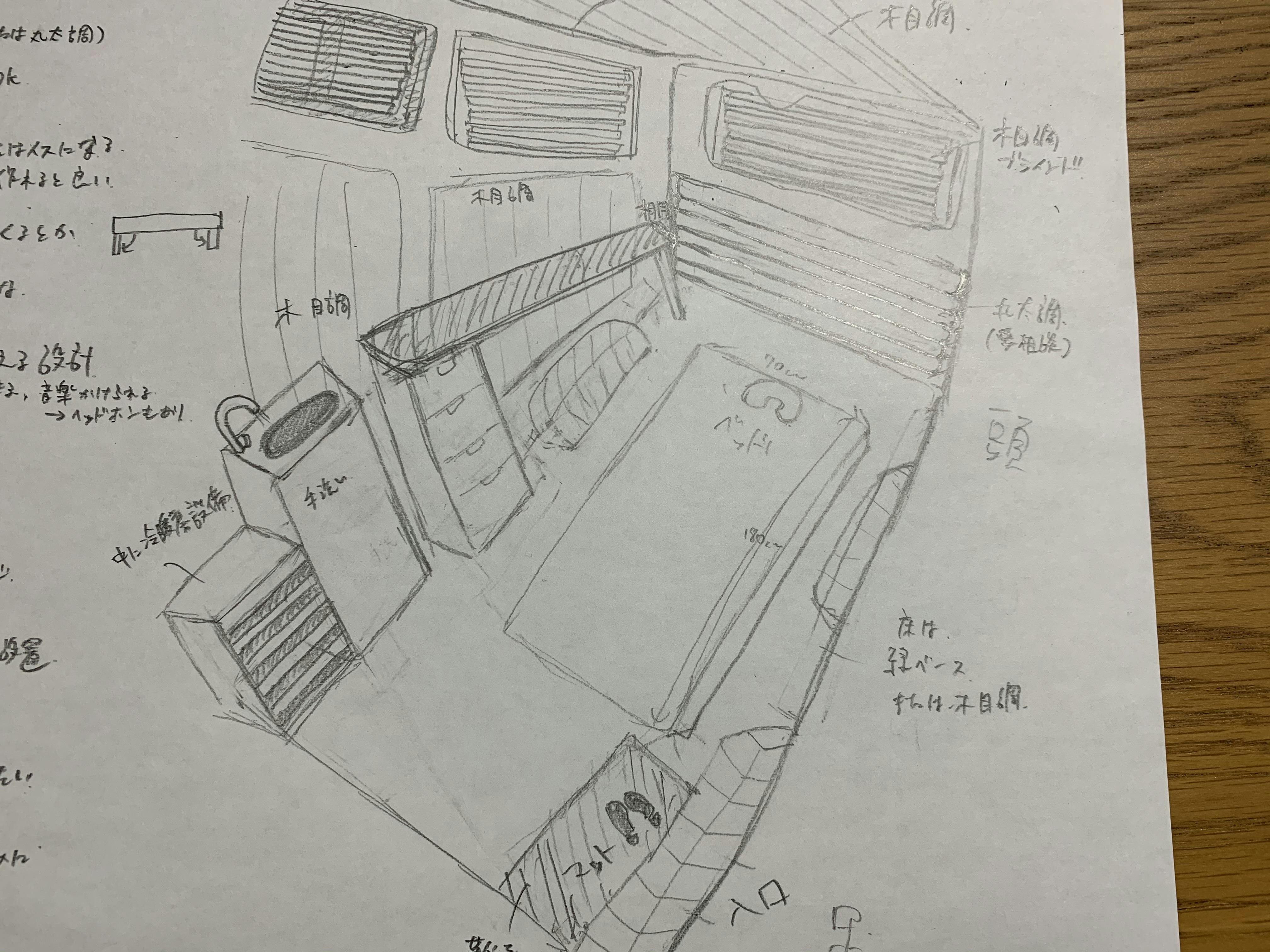 現在、車の内装案を詰めております。車自体は4月末頃に到着する予定なので、5月の頭から内装工事の作業を開始していく予定です。
