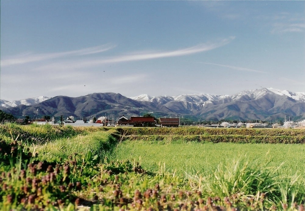 ●志ぐれ亭の眼前に広がる田んぼ、その先には会津平野、雄国山と磐梯山