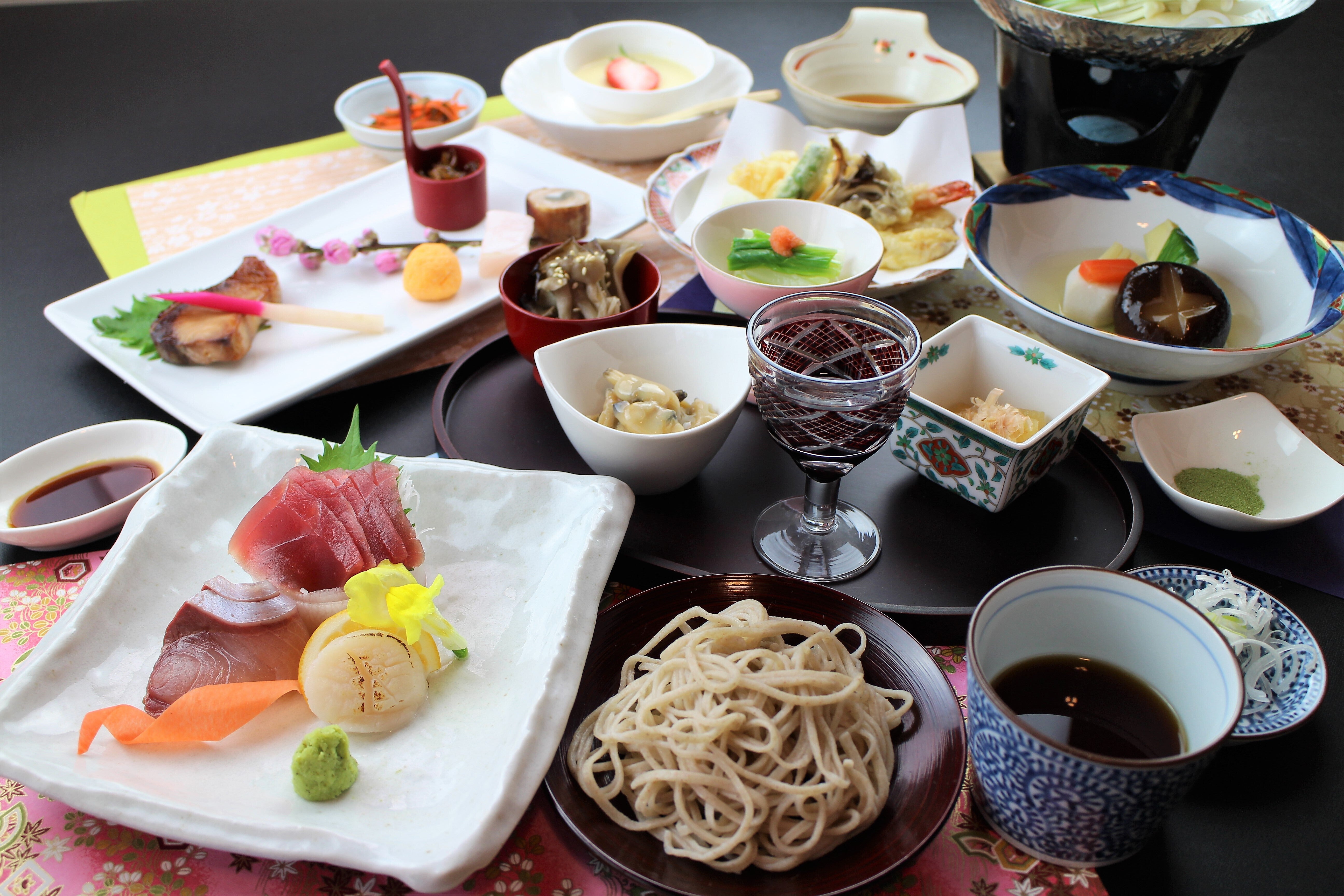料理長の懐石料理に、郷土料理と、専属の職人が打つ手打ちそば。