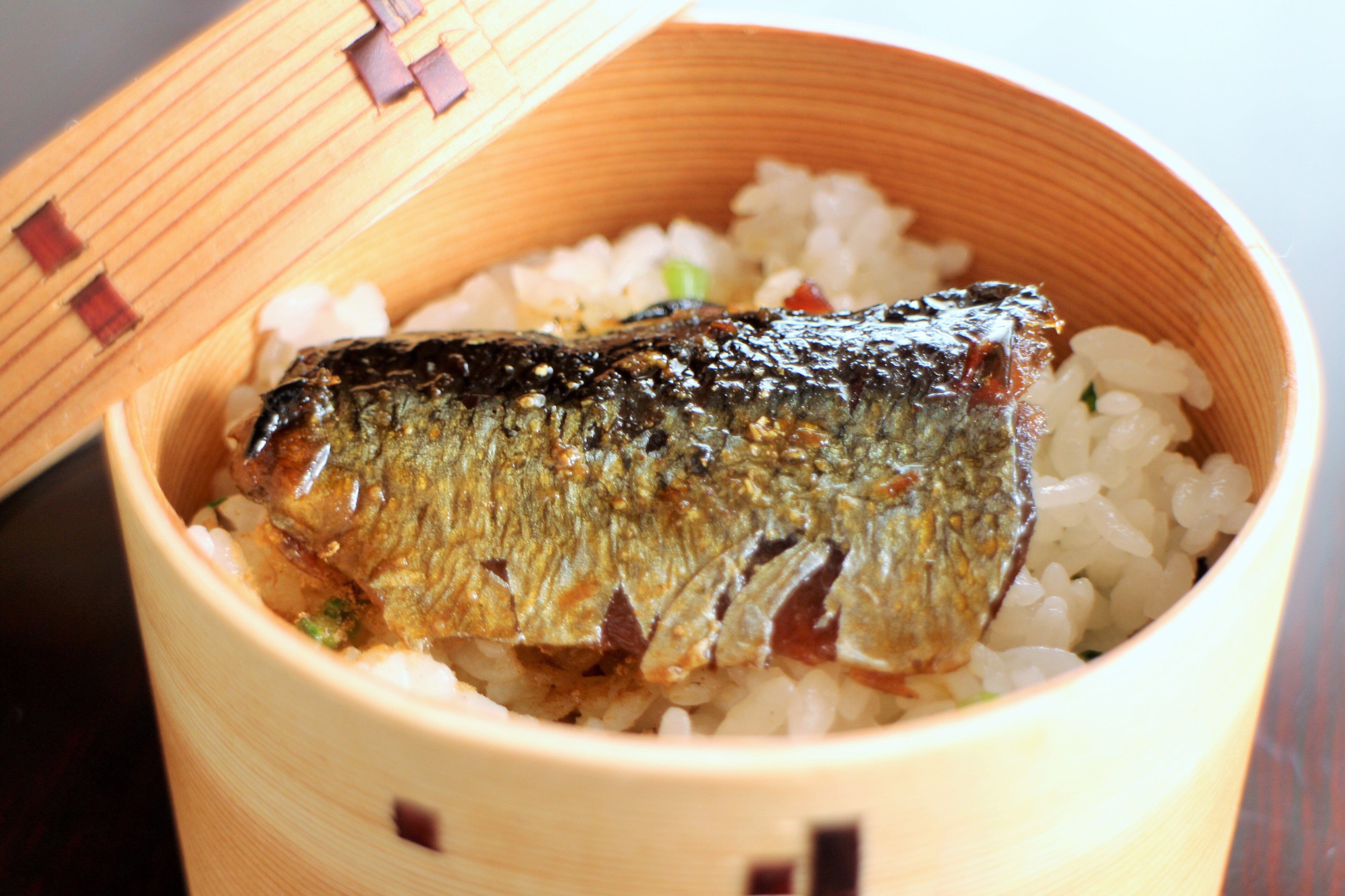 カチカチの干物の身欠きにしんを、三日の手間を掛けて臭みも余計な脂も小骨もとって、まるでうなぎの蒲焼のように仕上げた甘露煮、載せるご飯は目の前の契約農家米に、地元の大根菜っ葉の塩漬けをまぶした、地産地消スローフードです。(干物のにしんは会津の伝統食材です)