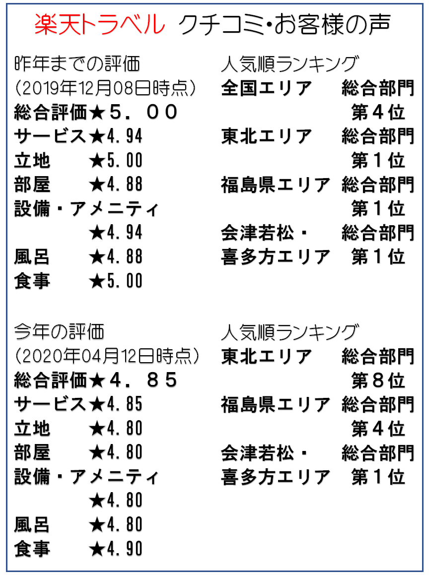 これまで、お客様からの声援もあって、宿泊のコンセプトは徐々に高評価を頂戴し、ネット上の旅行代理店の評価ランキングで「全国」や「東北」で「トップ10」入りをさせて頂いてます。