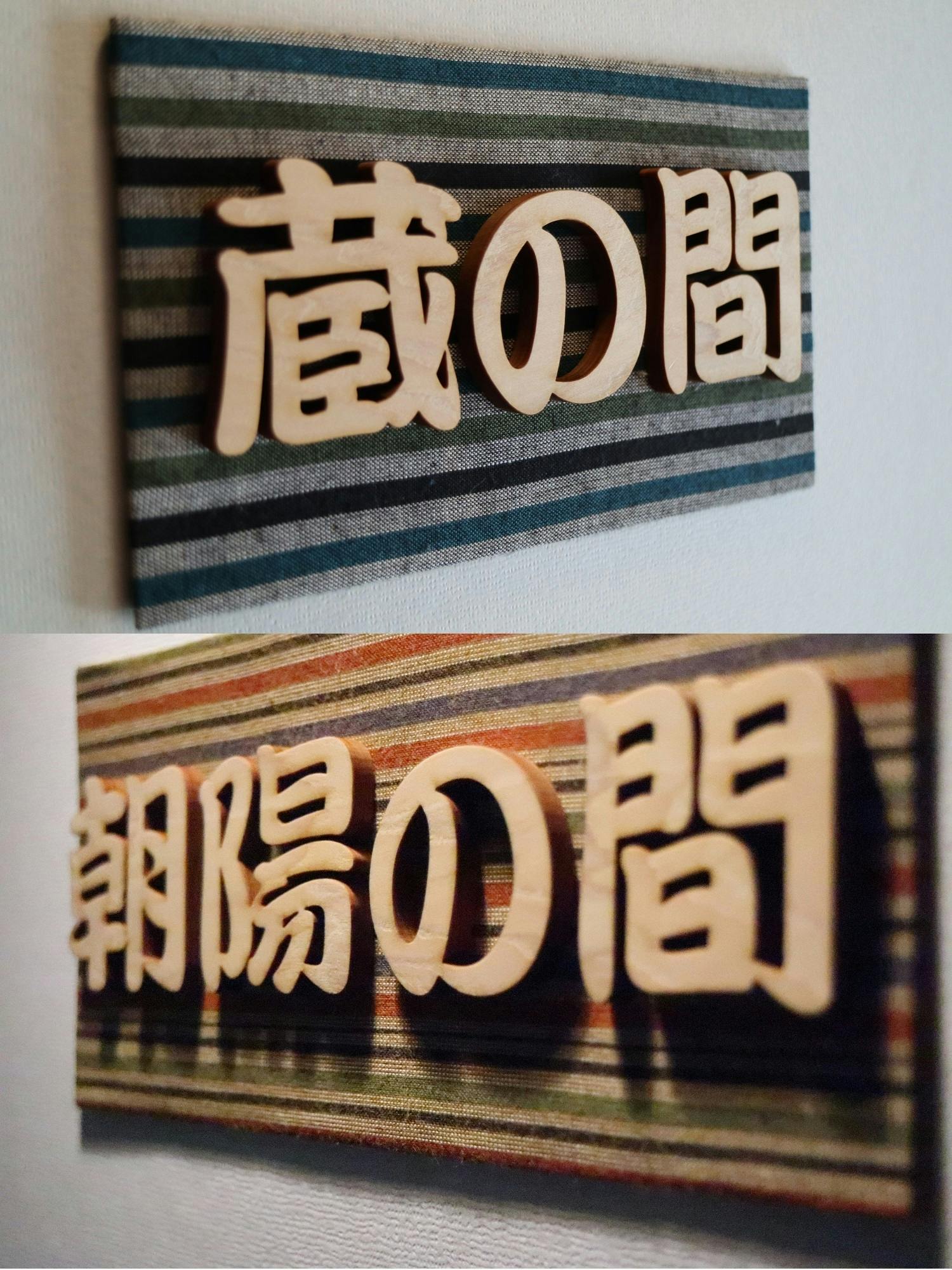 切り文字はさすがに作れないのでネットで注文し、各部屋のイメージカラーの会津木綿を使って、ダウンライトで照らすようにしました。
