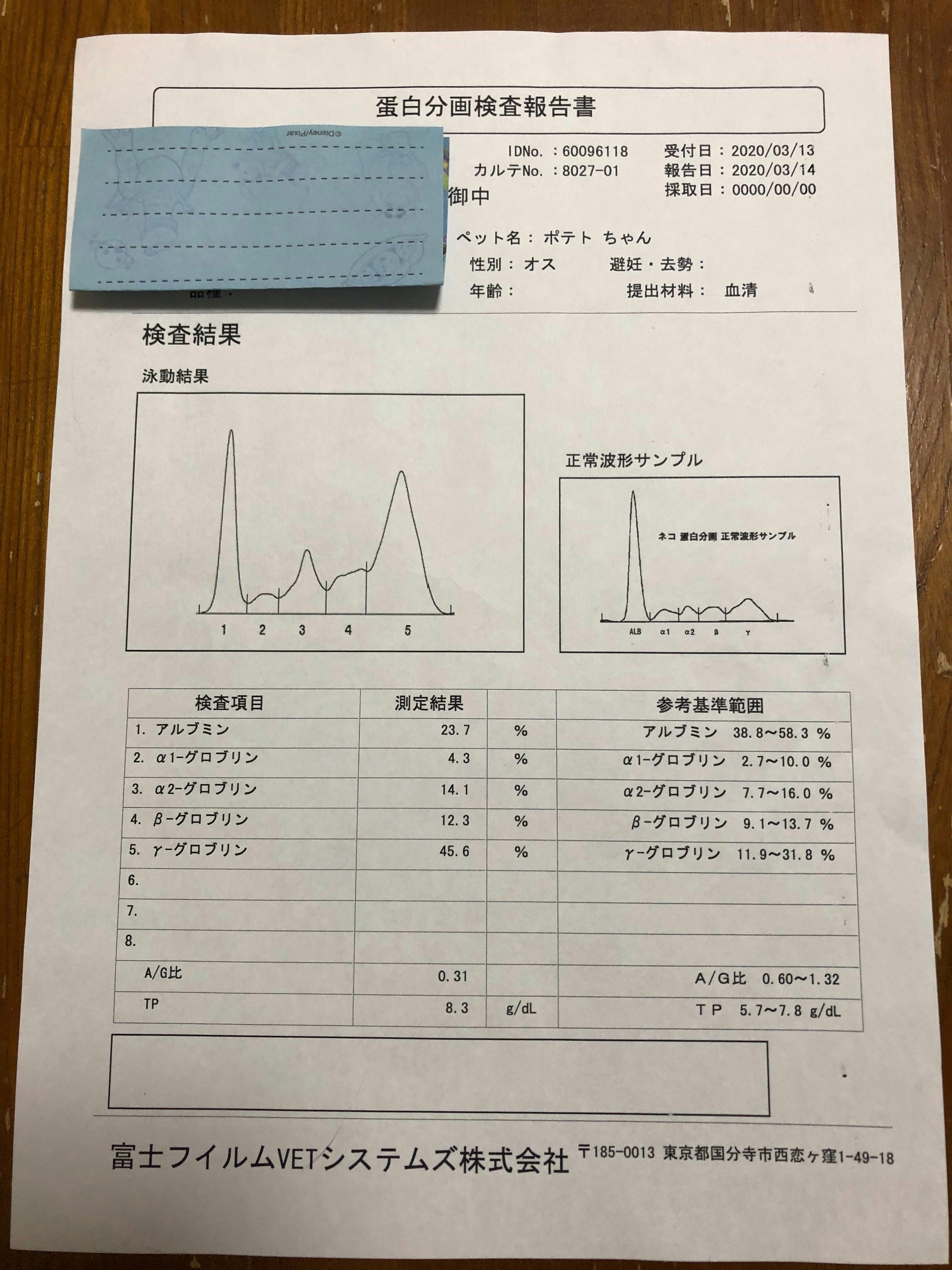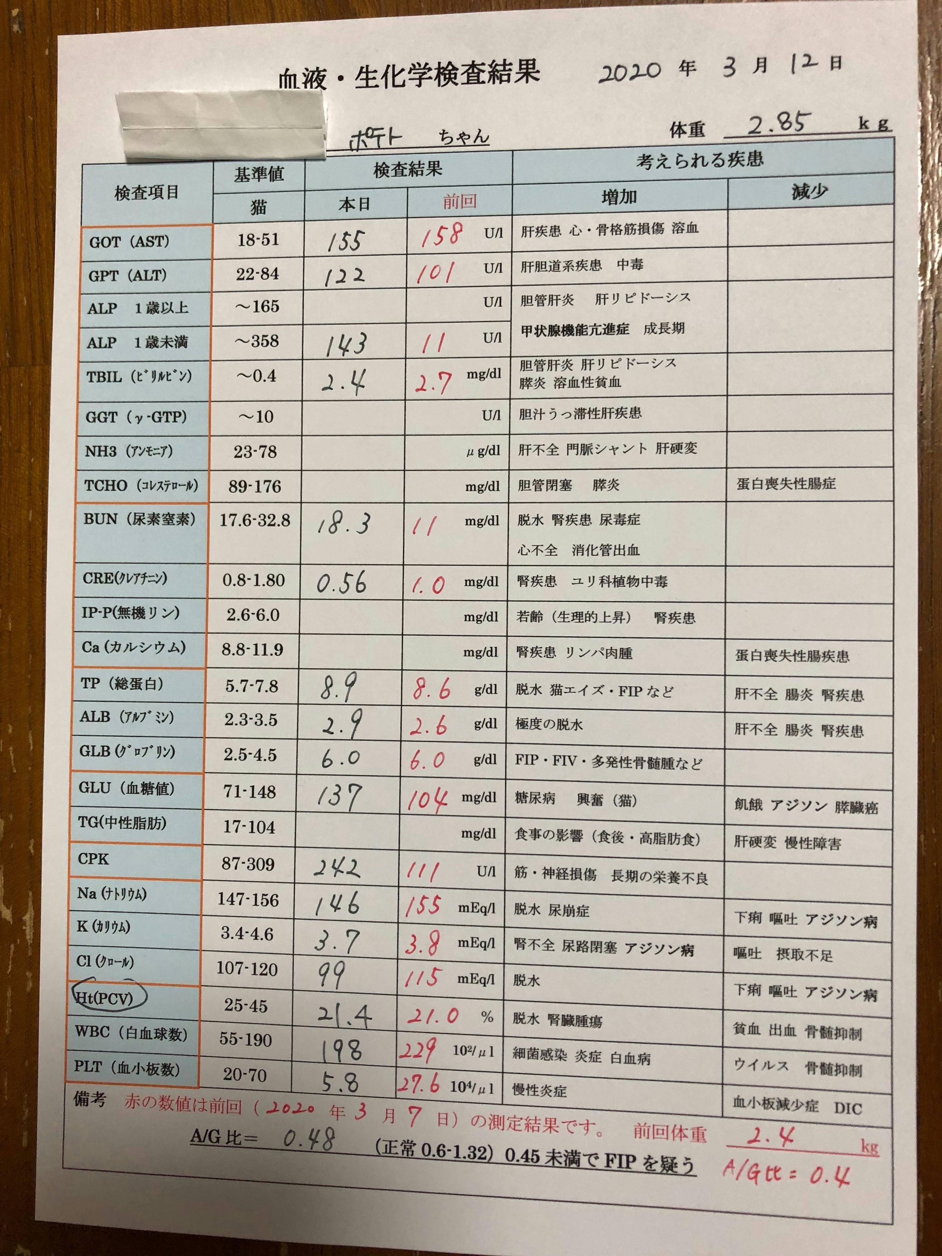 2020/09/07 23:09クラファンでは、大変お世話になりました。皆様からかのご支援に、ポテト共々感謝する日々を過ごしています。本当にありがとうございました。今回の診察結果をご報告させて頂きます。まず前回の外部へ依頼した検査結果ですが、すべて正常値でした。今回も、この2つの検査は、外部に依頼しています。今回の血液検査の結果です。すべて正常値でした。診療明細書です。今回の検査結果と、何事も無く3ヶ月間の経過観察が過ぎたので、獣医師から寛解で大丈夫と言う言葉を頂きました。半年前、FIPを発症した時には考えられなかった事です。皆様のお力添えのお陰でポテトは、FIPを寛解する事が出来ました。本当に、本当にありがとうございます。 もっと見る