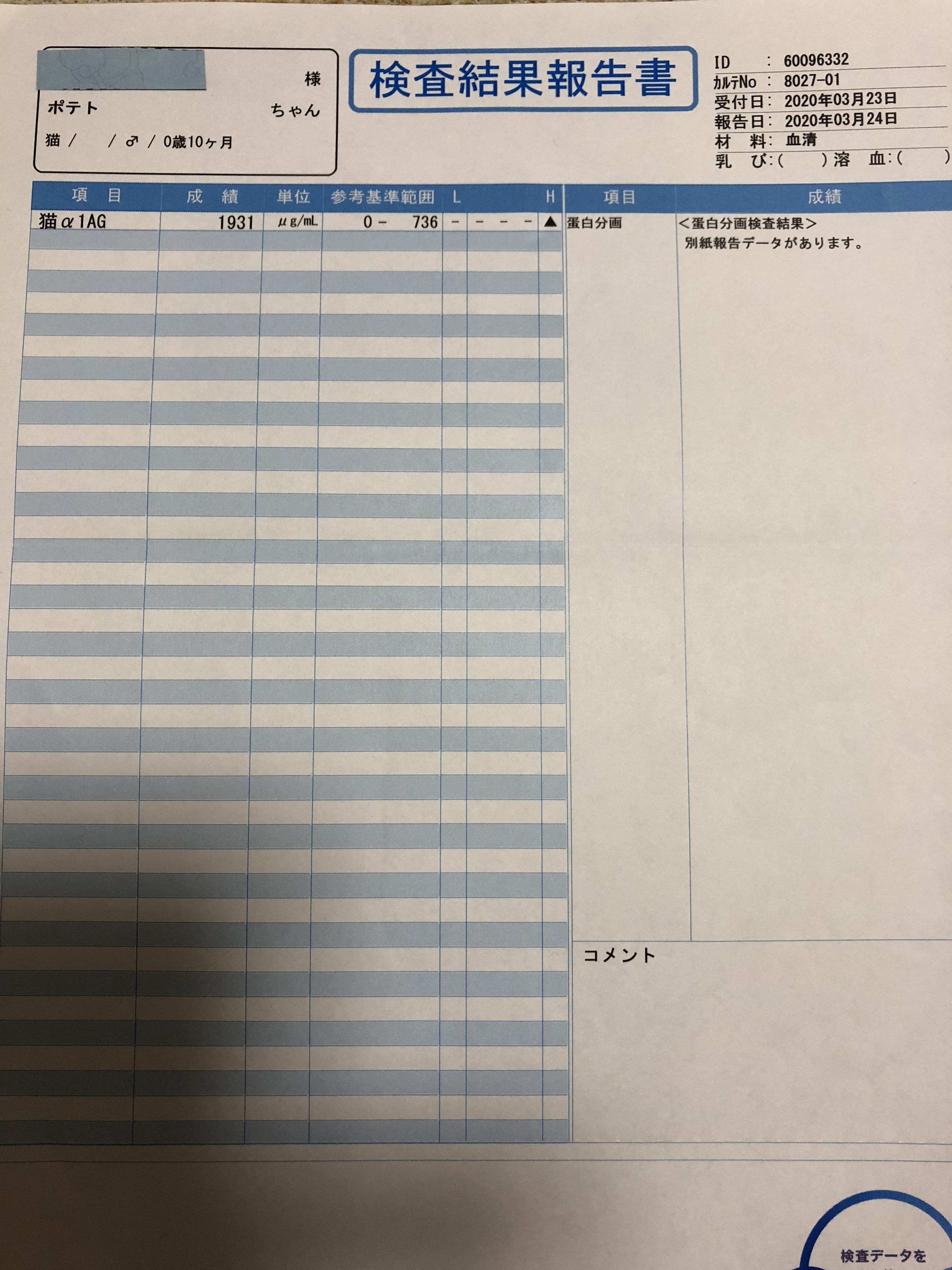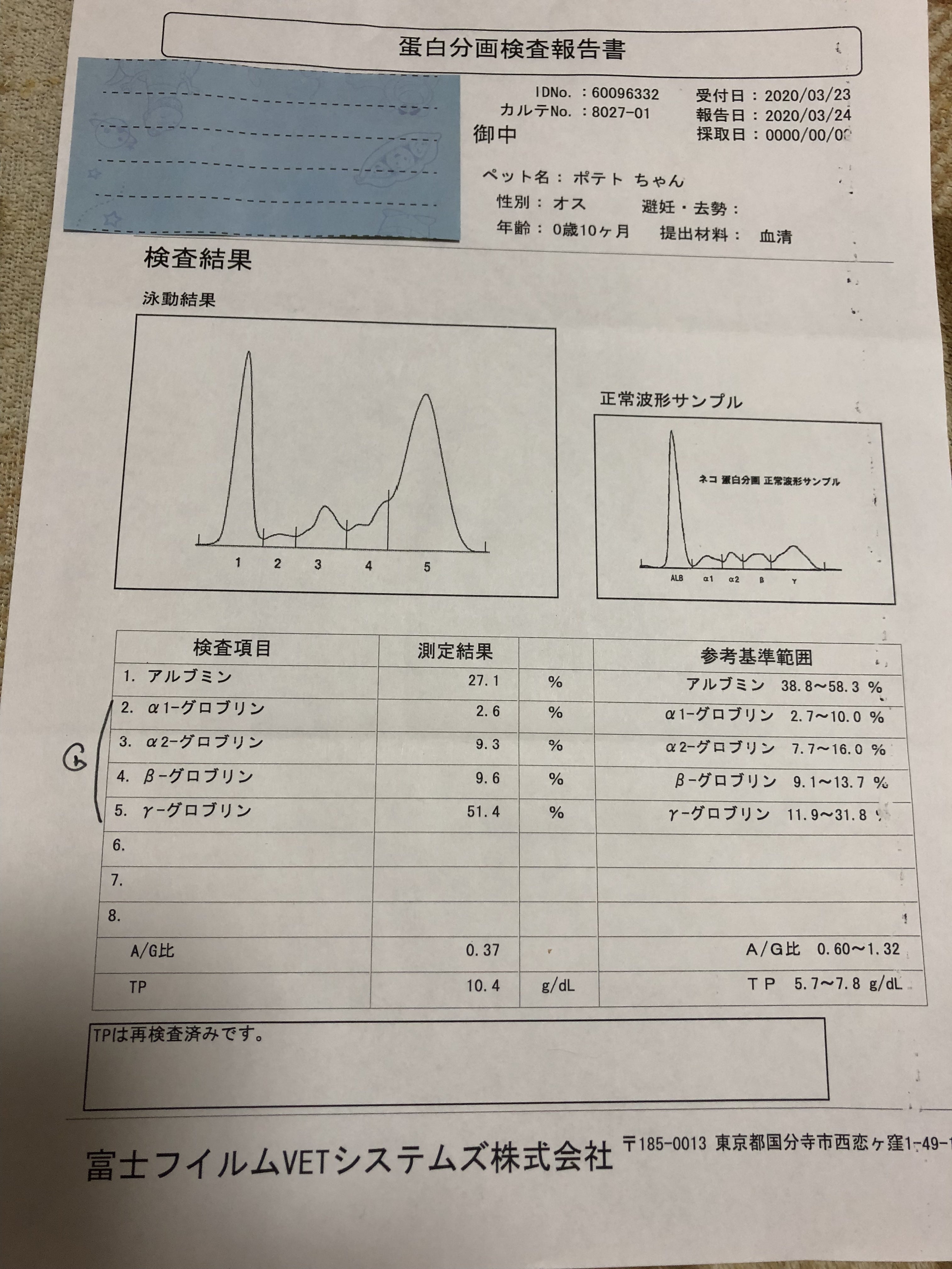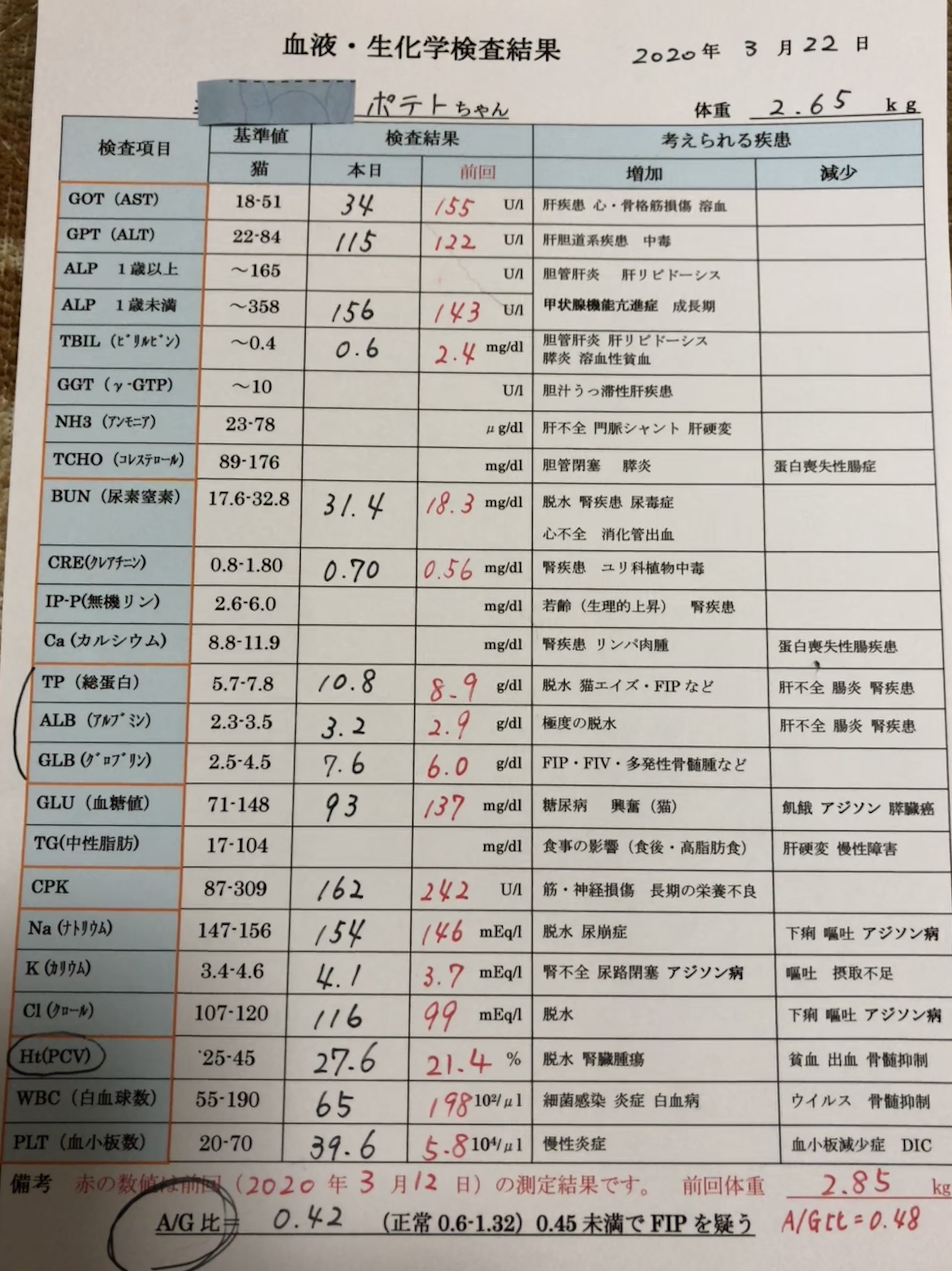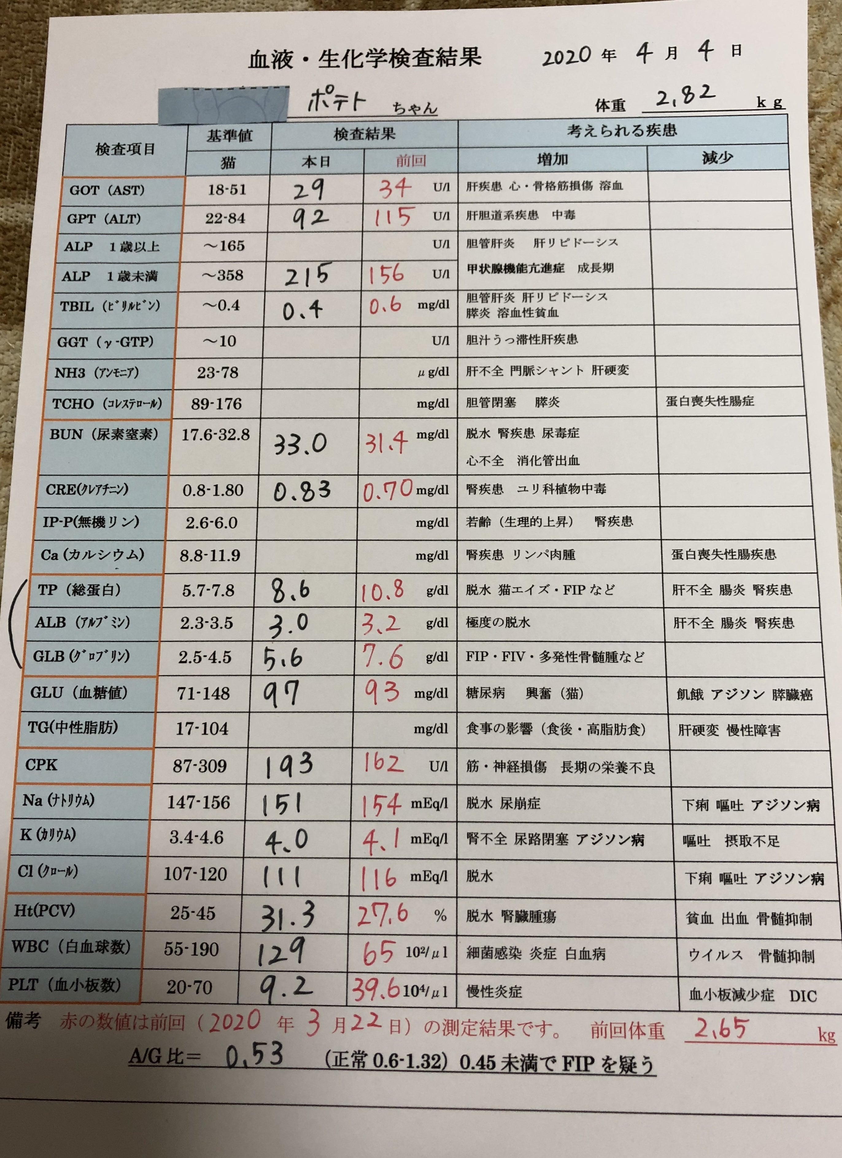 ポテトは、熱も下がり、食欲も出てきました。A/G比は、外部の検査結果では上がっていたので 2週間後の診察となりました。