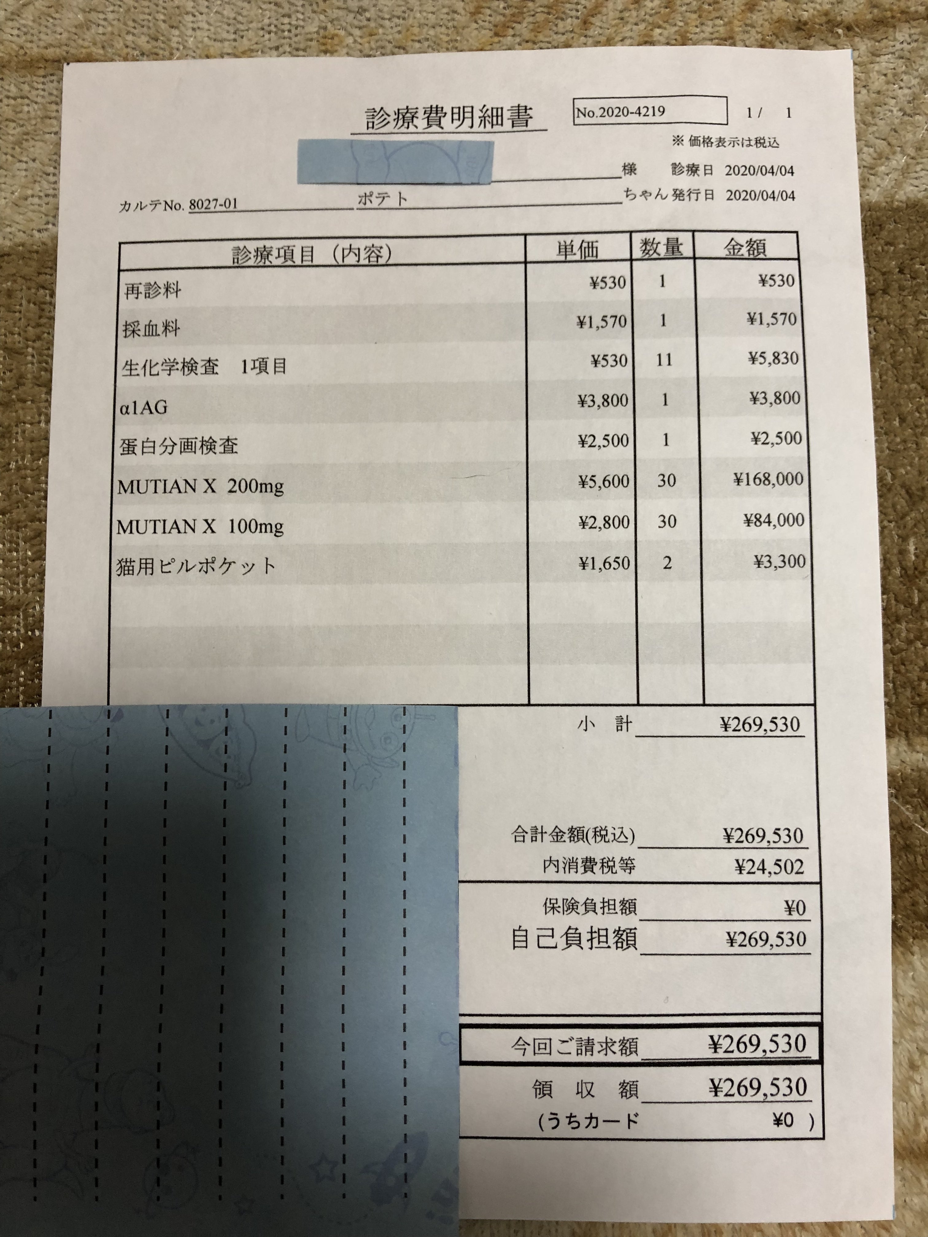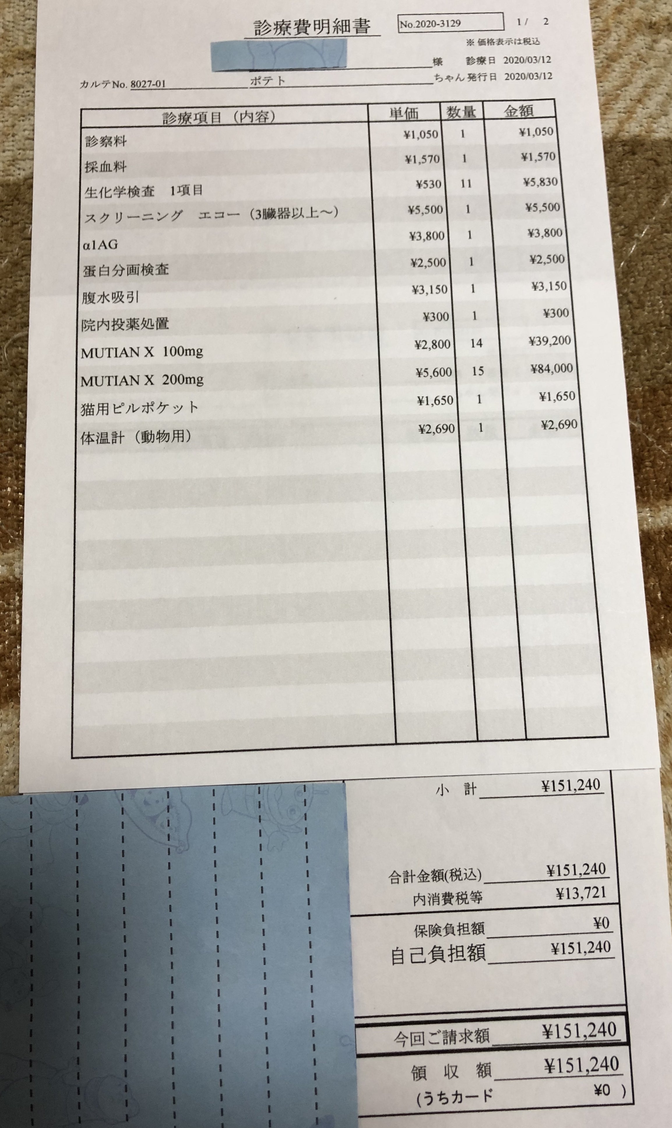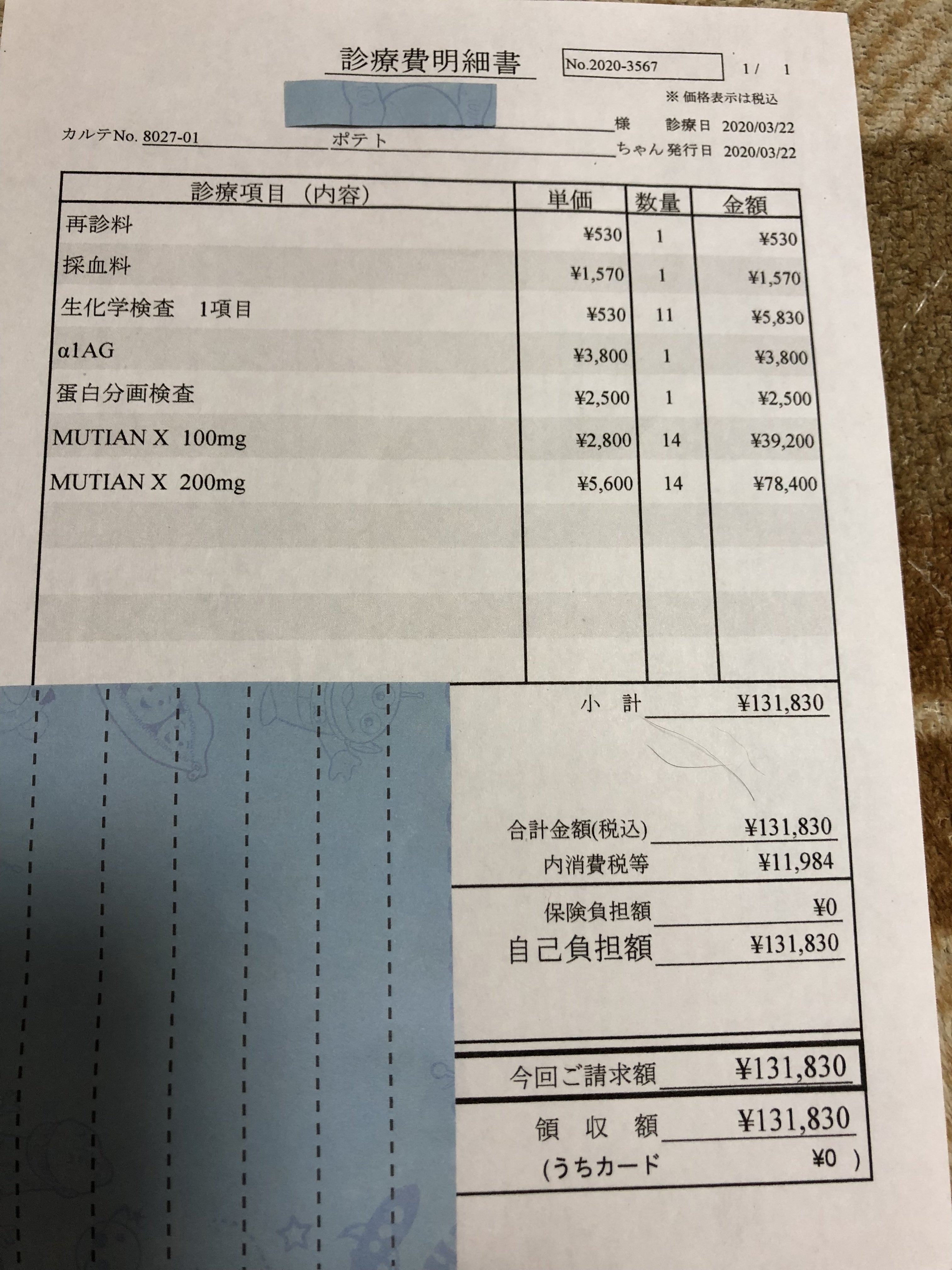 初診時(3月12日)の検査結果は、本文記載してありますが、診療明細を載せていませんでした。こちらになります。