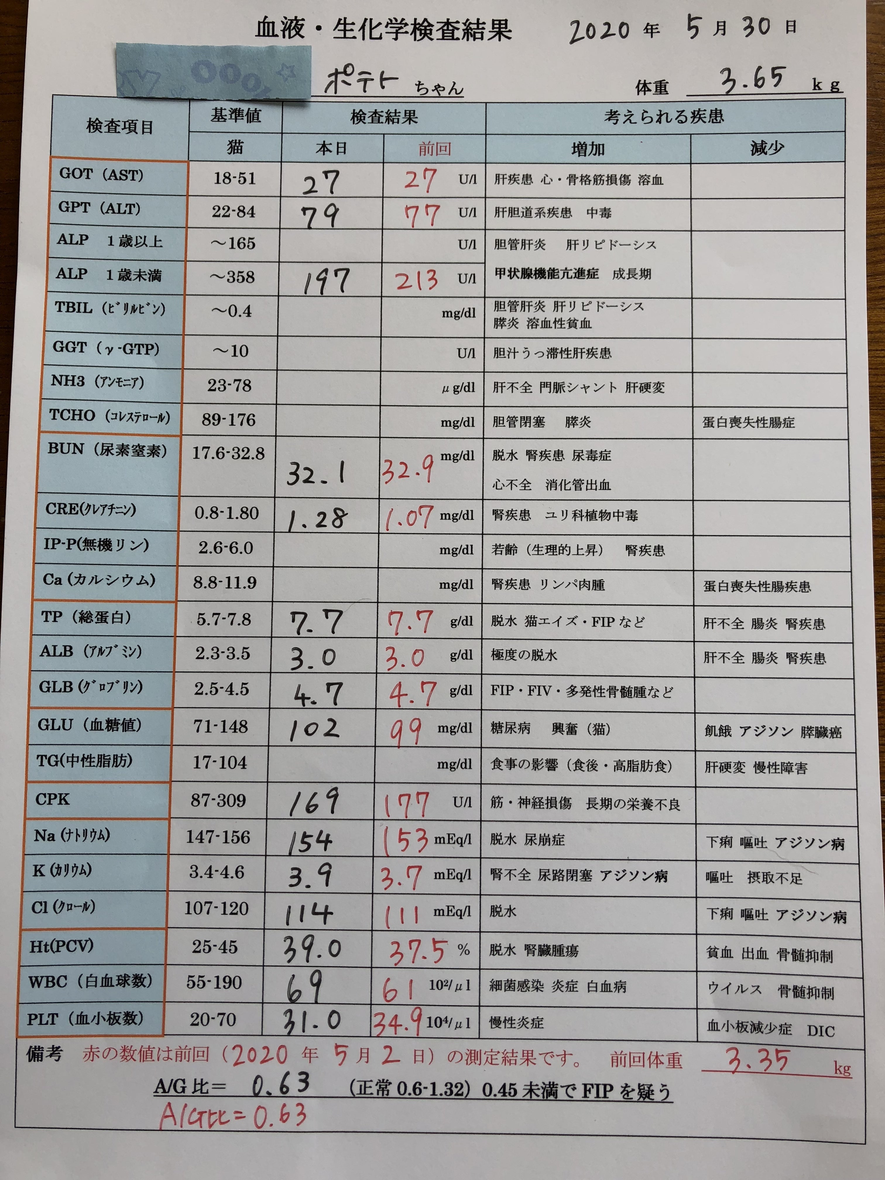 以上の結果から、(5月30日の診察時点では、投薬80日目です。) 予定通りに6月3日(投薬84日目)で投薬終了になります。外部に依頼しているFIP遺伝子検査の結果が陰性なのを 祈るばかりです。