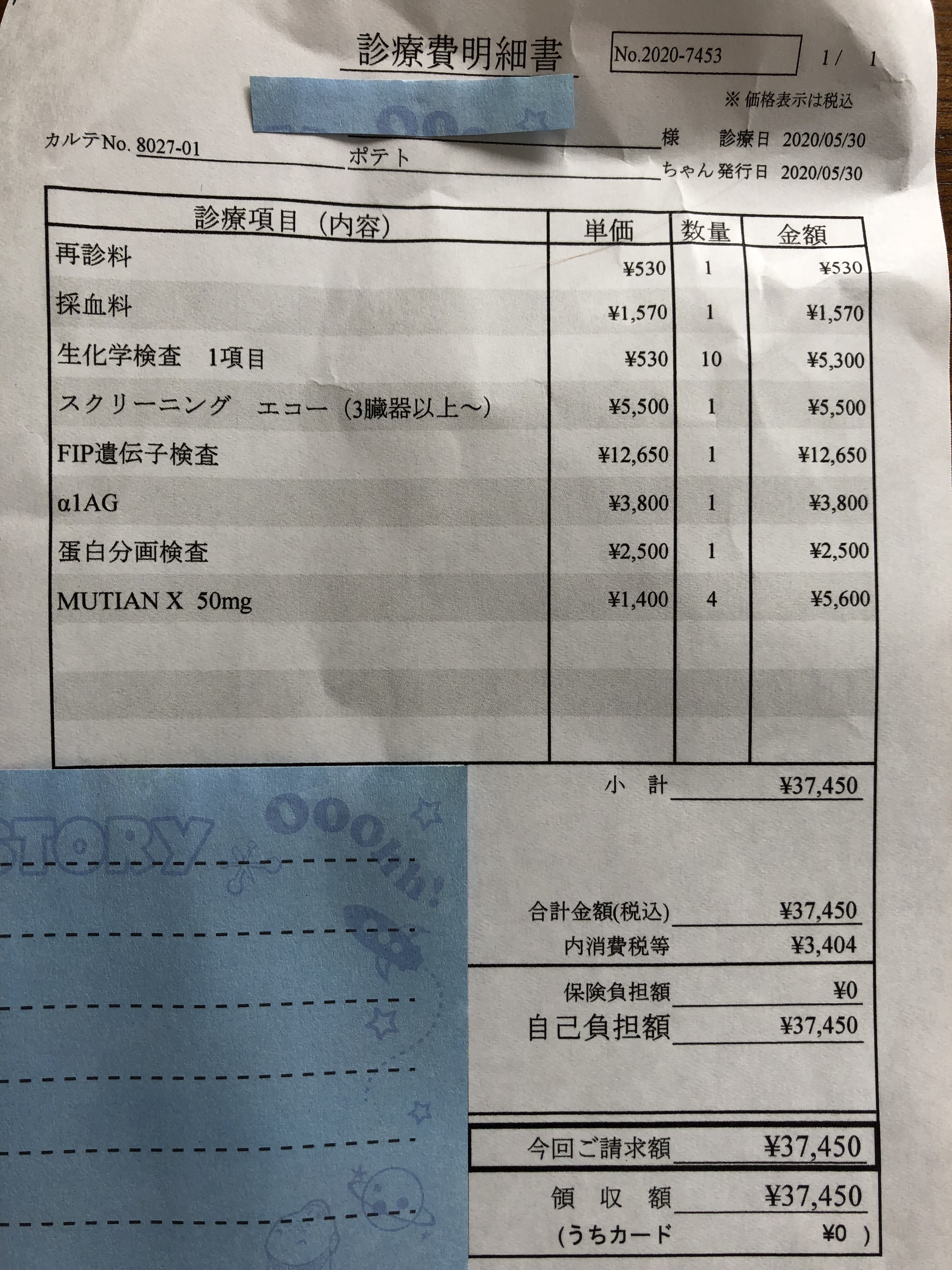 診療明細書です。体重が増えた為、足りない分を処方して頂きました。