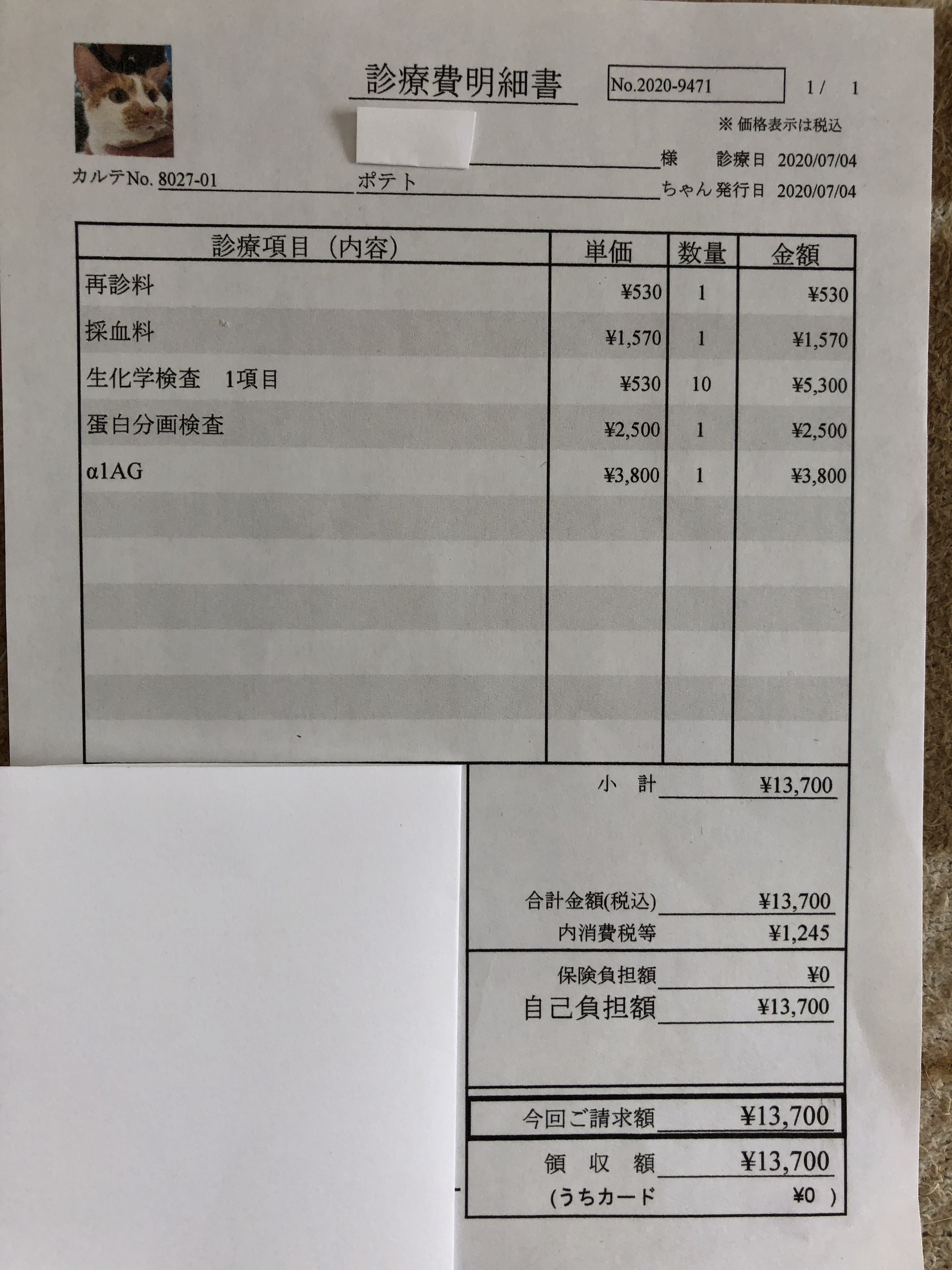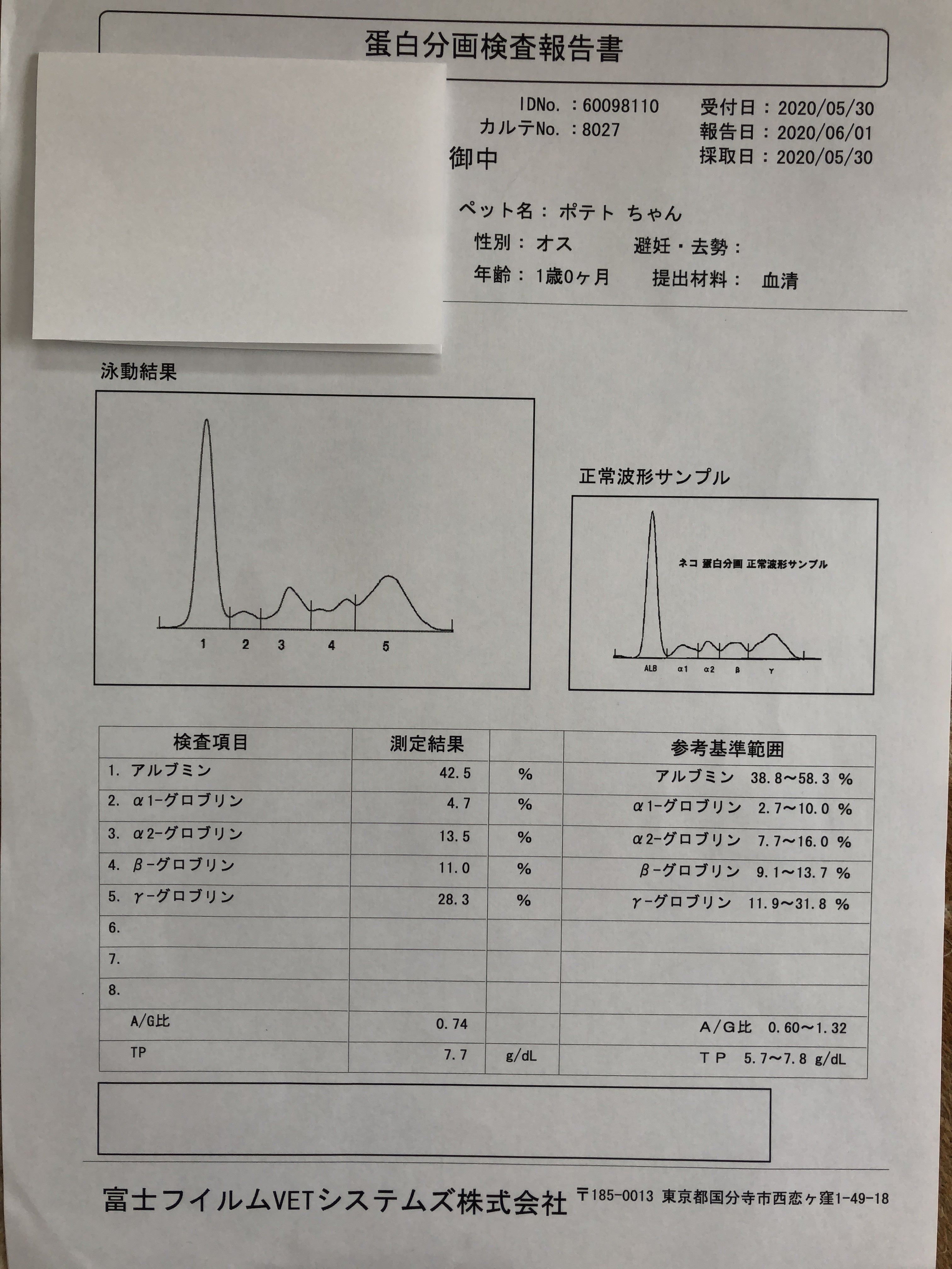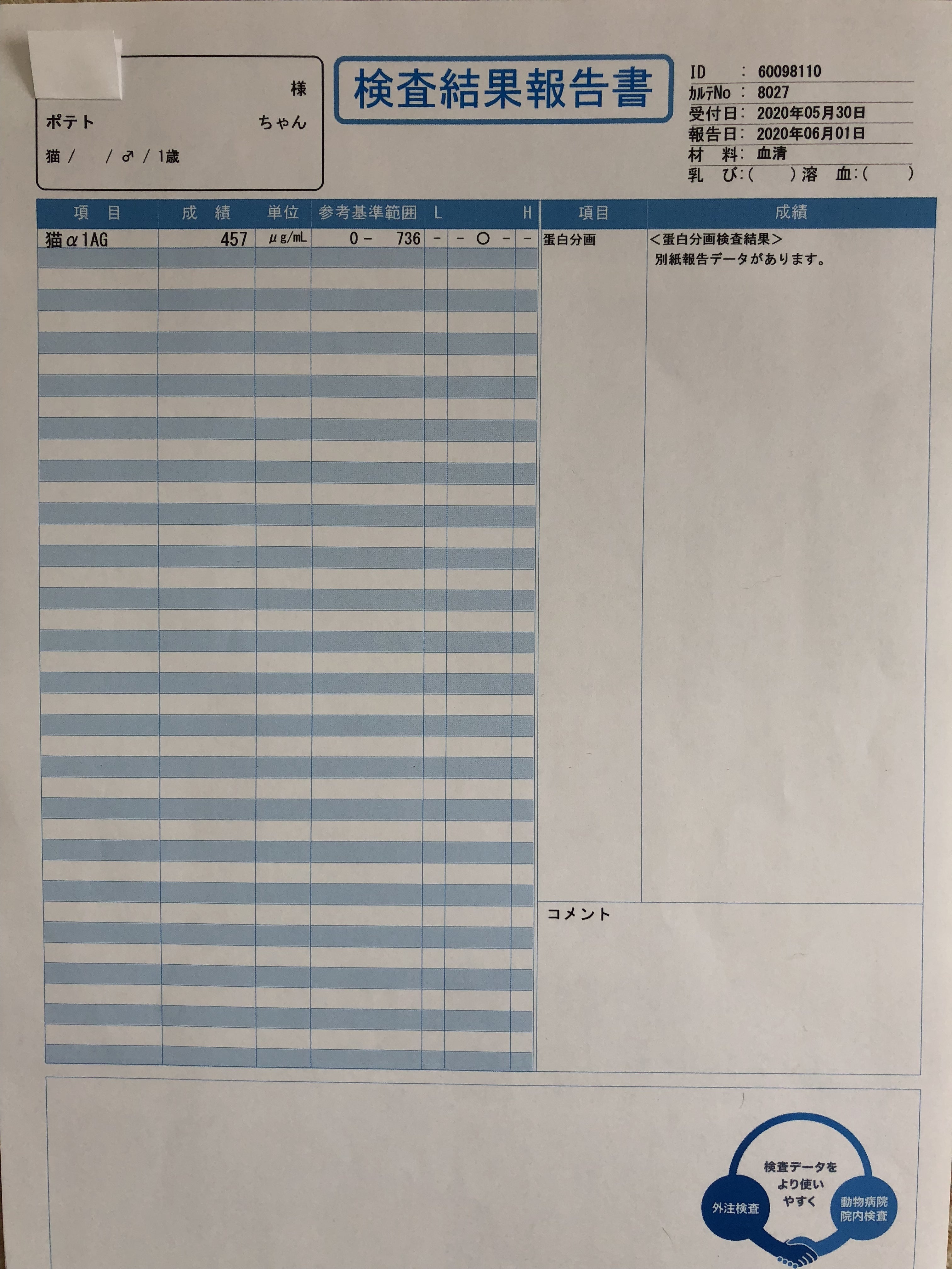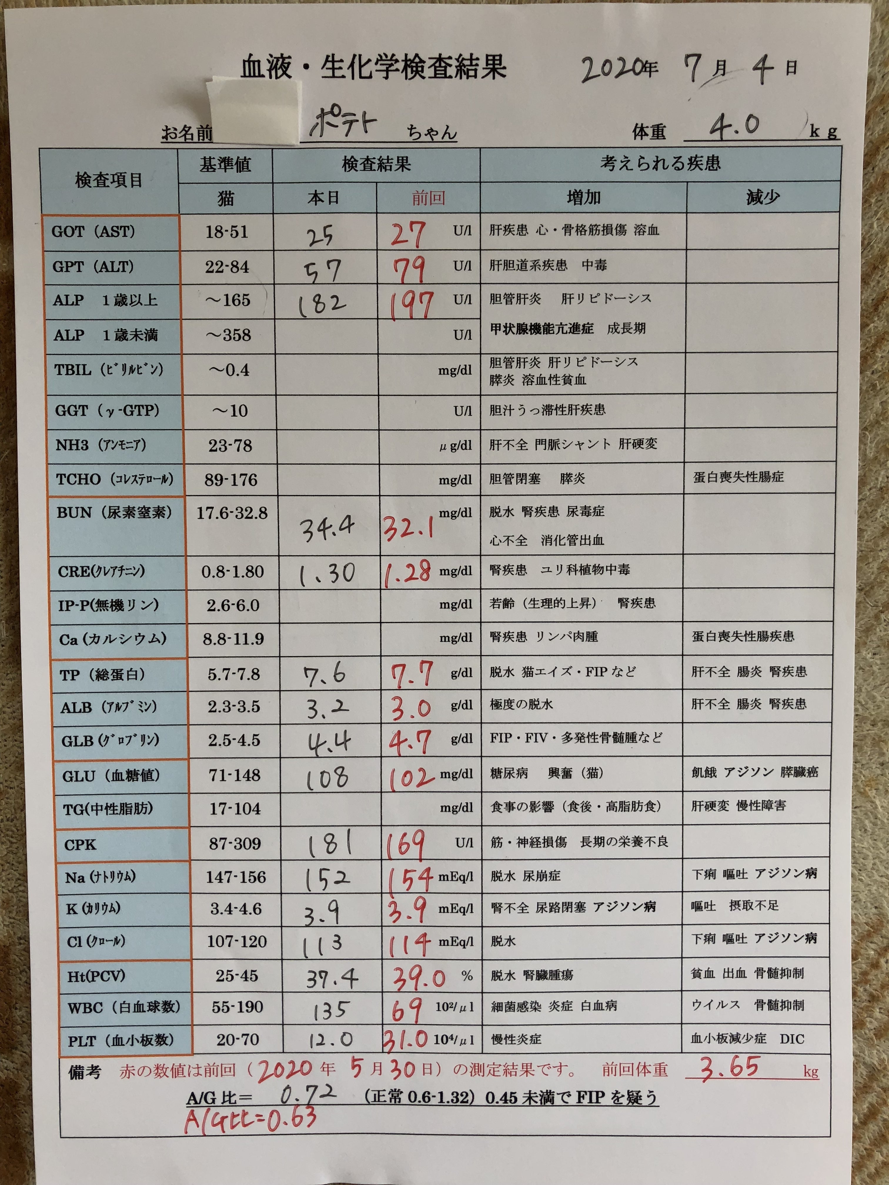 以上の結果から、医師よりポテトは順調だと言って頂きました。このまま何事も無ければ、次回は2ヶ月後の9月初旬の診察になります。