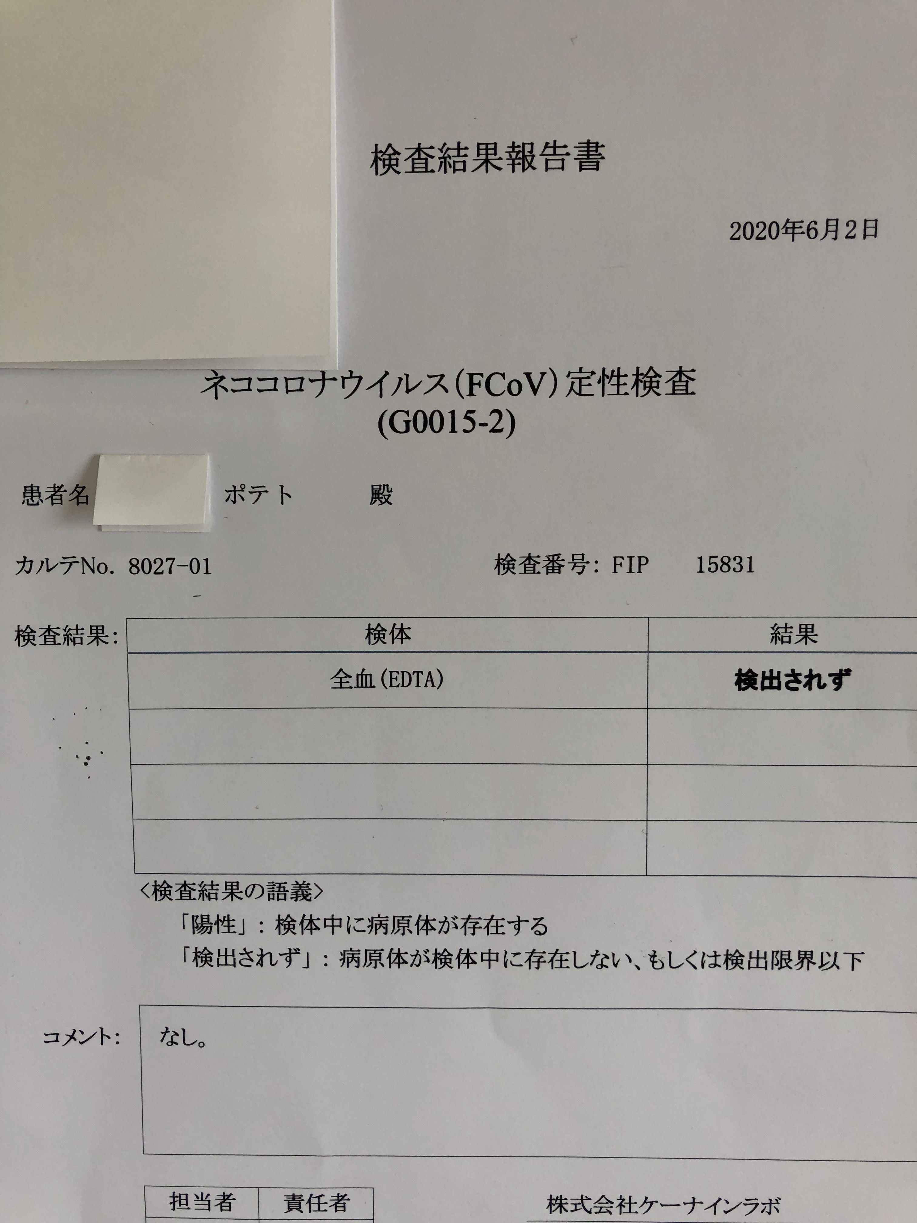 遺伝子検査の結果です。ウィルスが検出されていないという事なので、FIP陰性となりました。