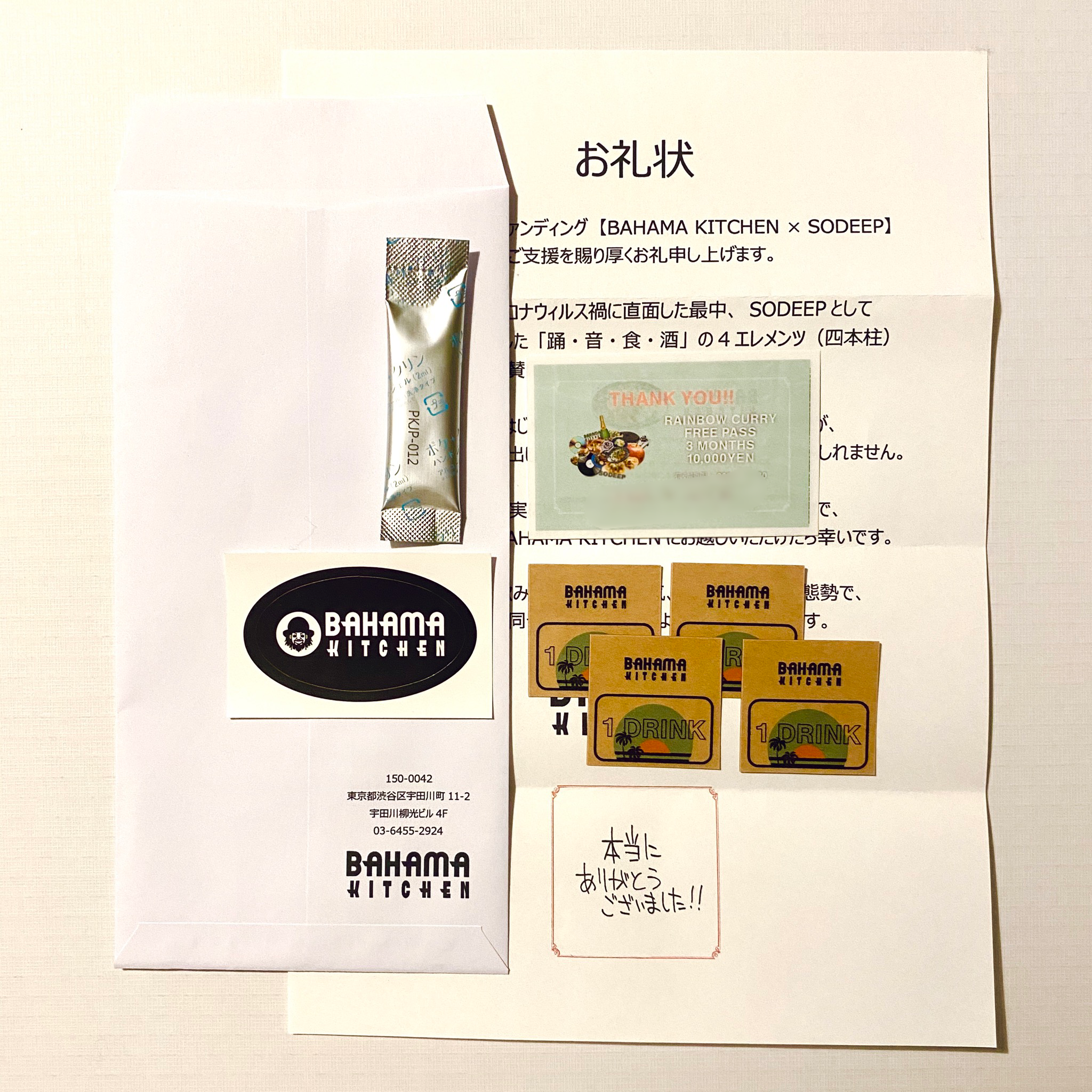 2020/06/13 18:03ドリンクチケット、レインボーカレーチケット発送&店頭受取り下記2点、リターンのチケットを準備完了いたしました。チケットに、お礼状、BAHAMA KITCHENステッカー、除菌ハンドジェルを同包させていただきました。【BAHAMA KITCHEN ドリンクチケット4枚プラン】 郵送希望の方には6月15日よりご指定の送付先に届くよう手配いたしました。店頭受け取りの方は6月15日より店頭にて身分証をご提示の上お受け取り下さい。※ご利用は2020年7月1日から2021年7月31日までの1年間+1ヶ月となります。【レインボーカレー3ヵ月間フリーパスプラン】上記リターンに支援頂きました皆さま全員にチケットを6月15日より指定の送付先に届くよう手配いたしました。チケットには支援者様のお名前を印字しております。ご利用の際はご本人様確認のため、店頭にてチケットと身分証の2点のご提示にご協力ください。※ご利用は2020年7月1日から2020年9月30日までの3ヶ月となります。その他リターンも準備を進めておりますので、いましばらくお待ち下さいませ!! もっと見る