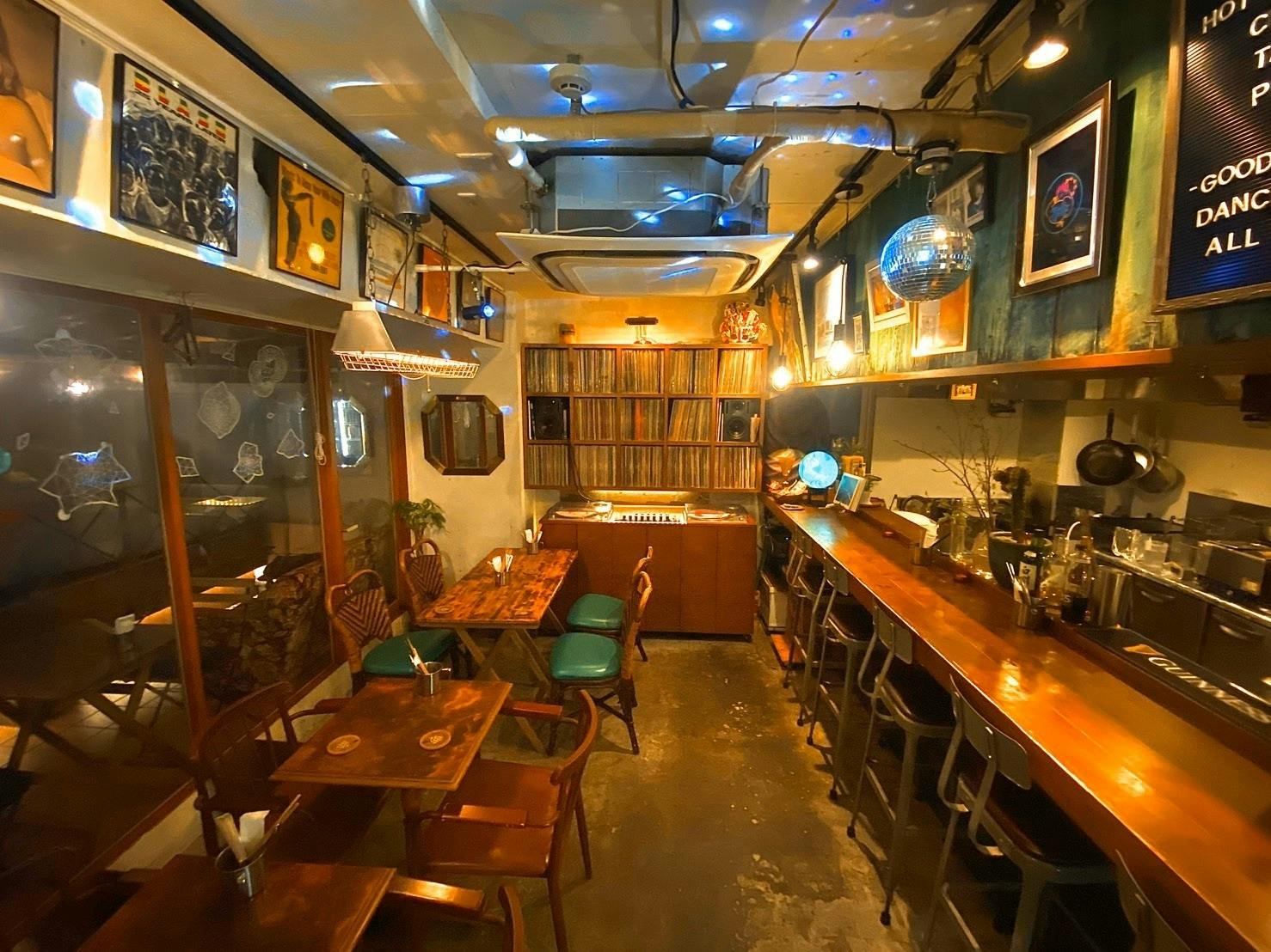 BAHAMA KITCHENの顔でもある重量感たっぷり、自慢のDJブース、そしてエントランスを跨いだ瞬間飛び込むレコード棚、丸見えの吊り棚は良き変貌を遂げ、ヒロのお陰でどれも存在感も抜群。