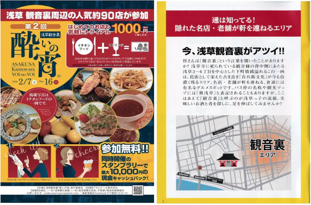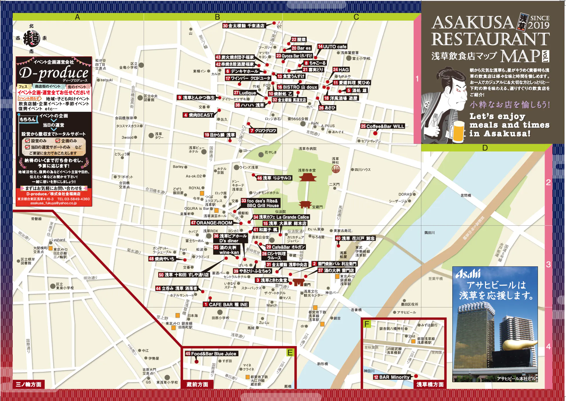 観光客の方にも浅草の色んなお店を知っていただきたいと思い、アサヒビール様の協賛のもと、インバウンド対応を兼ねた回遊性マップ「浅草レストランマップ」を12000部発刊。