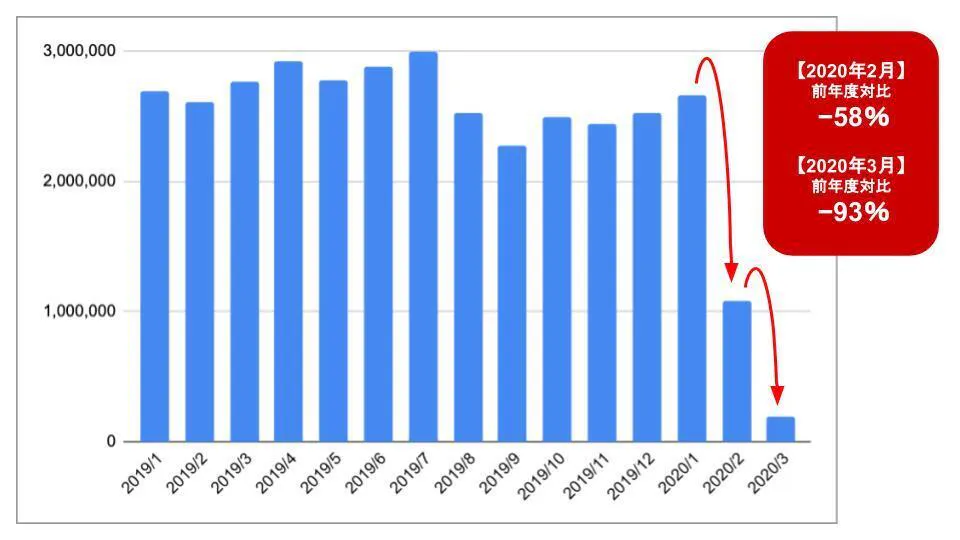3月は、更に減少し、前年度対比で「93.0% 減」の19万3700人でした。