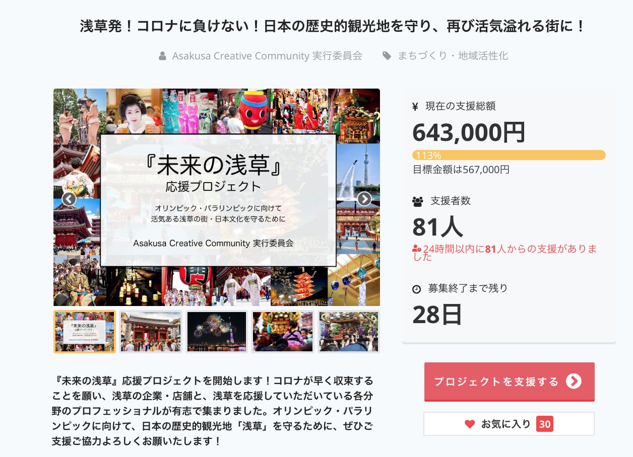 2020/04/16 21:06こんばんは!「Asakusa Creative Community 実行委員会」です。皆様の温かいご支援ご協力のお陰で、プロジェクト公開初日、なんと、8時間で、目標金額の56万7000円(コロナ!)を達成しました!「打倒!コロナ!!」で設定した目標金額(56万7000円)を初日で達成できて嬉しいです!温かいメッセージやお気に入り登録、FacebookやTwitterのシェアなど、沢山ご協力いただきありがとうございます。浅草の街が再び盛り上がるように、ここからがスタートだと思って、参加店舗一丸となってプロジェクトを盛り上げてまいります。日本の観光地「浅草」という街でこのプロジェクトが立ち上がったことにより、日本全国各地や、世界に少しでもエネルギーを届ける事ができたら幸いです。新型コロナウイルスが1日でも早く収束する日が来る事を祈りながら、皆様と一緒に日本の観光地「浅草」を盛り上げていけたら嬉しいです。引き続きご支援ご協力よろしくお願いいたします。気になるネクストゴールは明日、発表いたします!! もっと見る