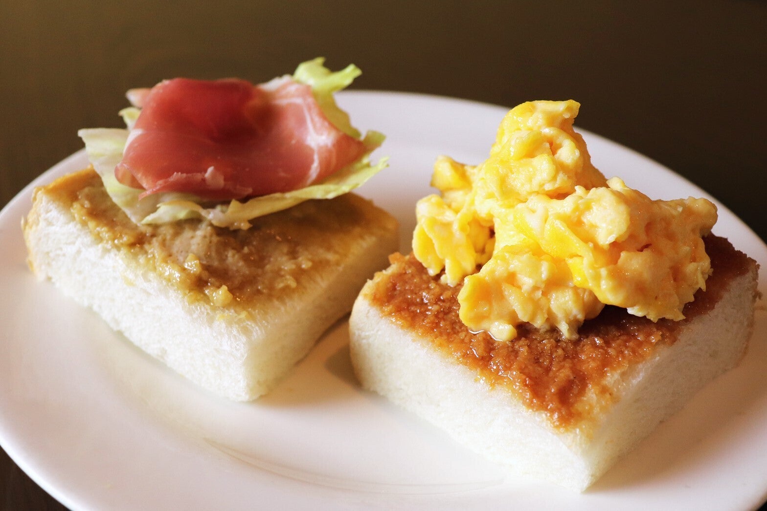 となりは、マヨネーズとオイシイコメヌカを半々に混ぜたものをぬってレタスと生ハムをのせました。