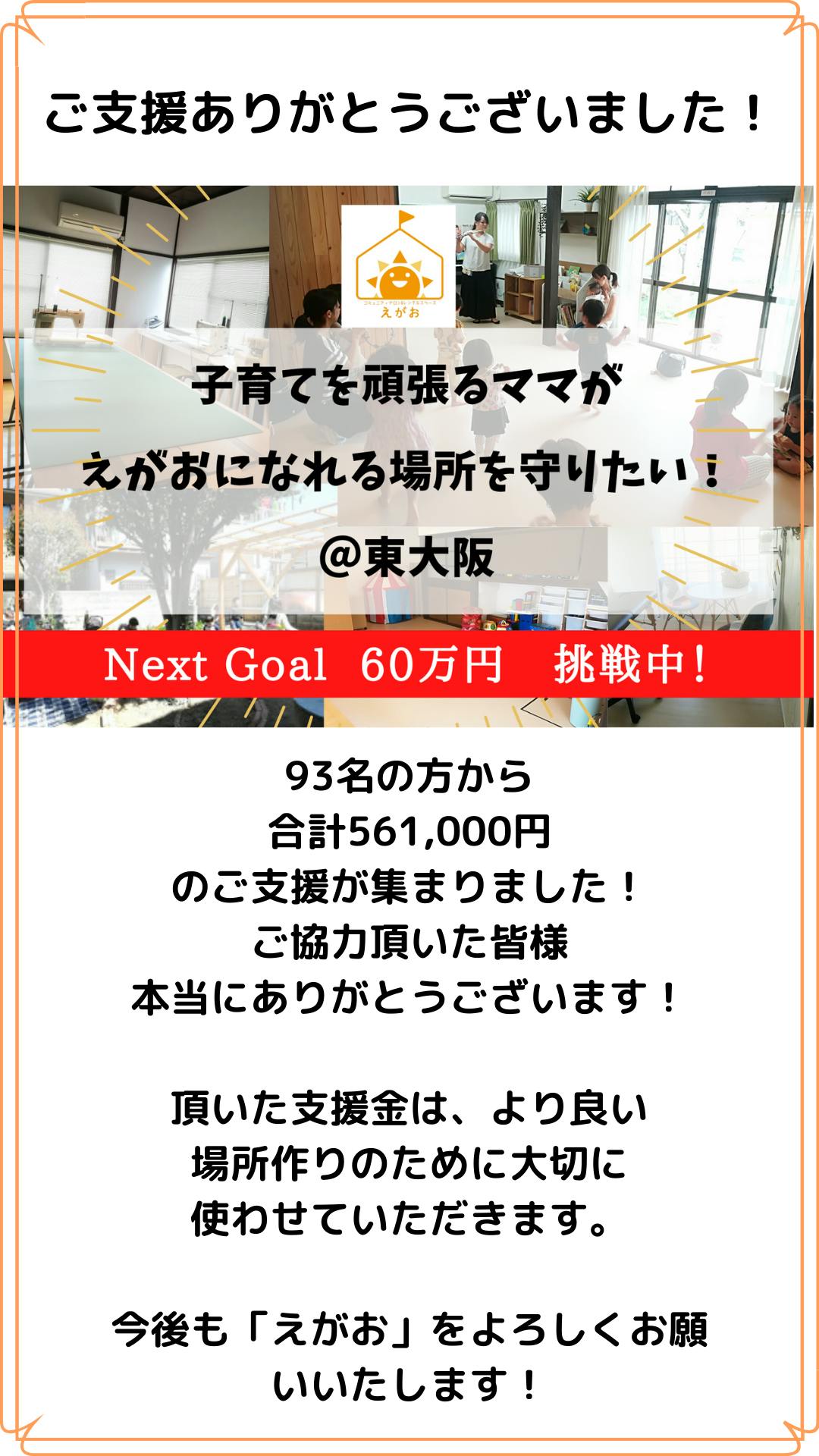 2020/05/21 05:21「子育てを頑張るママが、えがおになれる場所を守りたい@東大阪」無事にクラウドファンディング終了しました!沢山のご支援を頂き大変感謝いたします。今後のより良い運営のために活用させて頂きたいと思います!リターンの準備を順次速やかにさせていただき、ご支援頂いた方々には改めてご報告とお礼を申し上げます。宿女和子 もっと見る