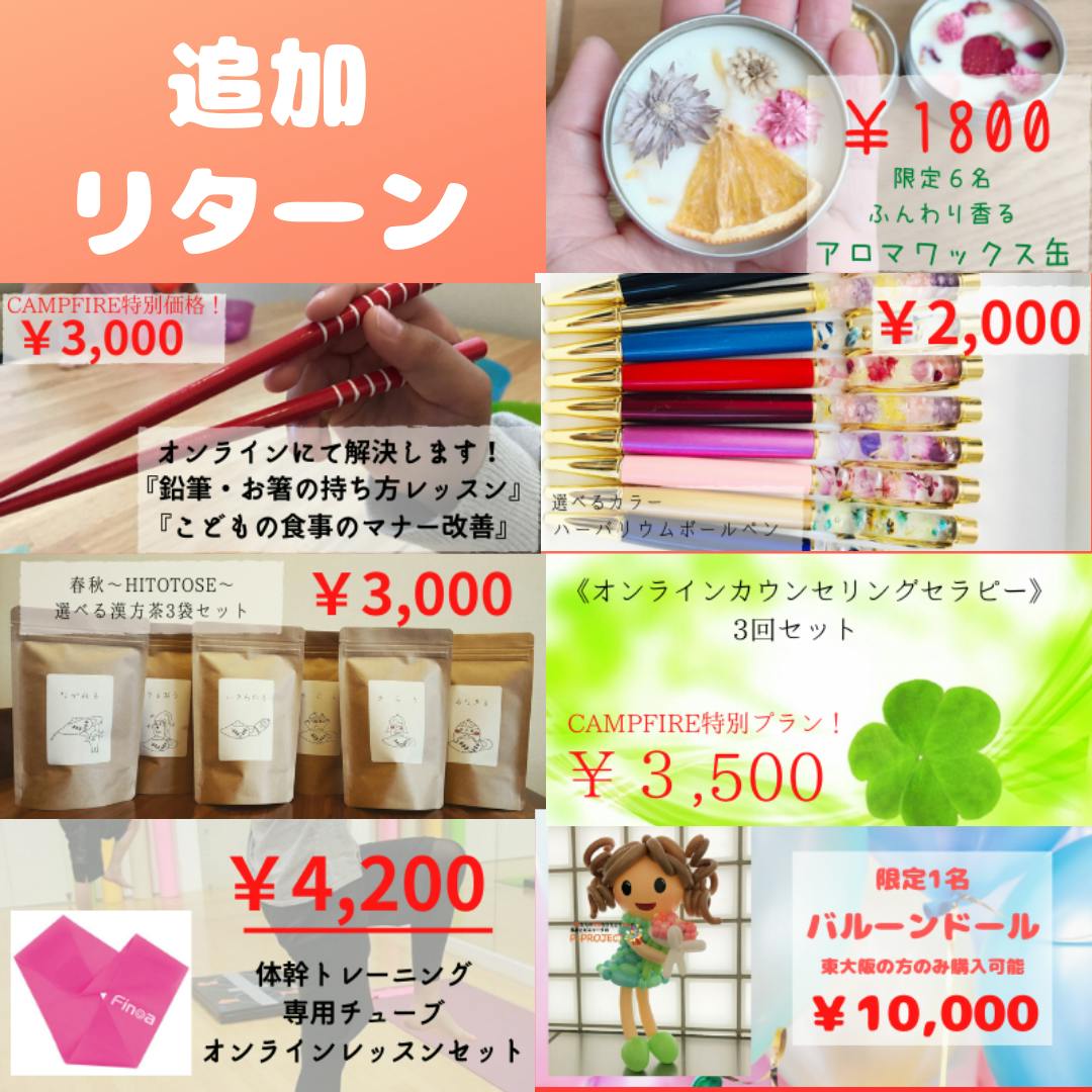 ページに反映されるまでしばらくお時間かかるかもしれませんが、詳細は各リターンの説明よりご覧ください(^^)
