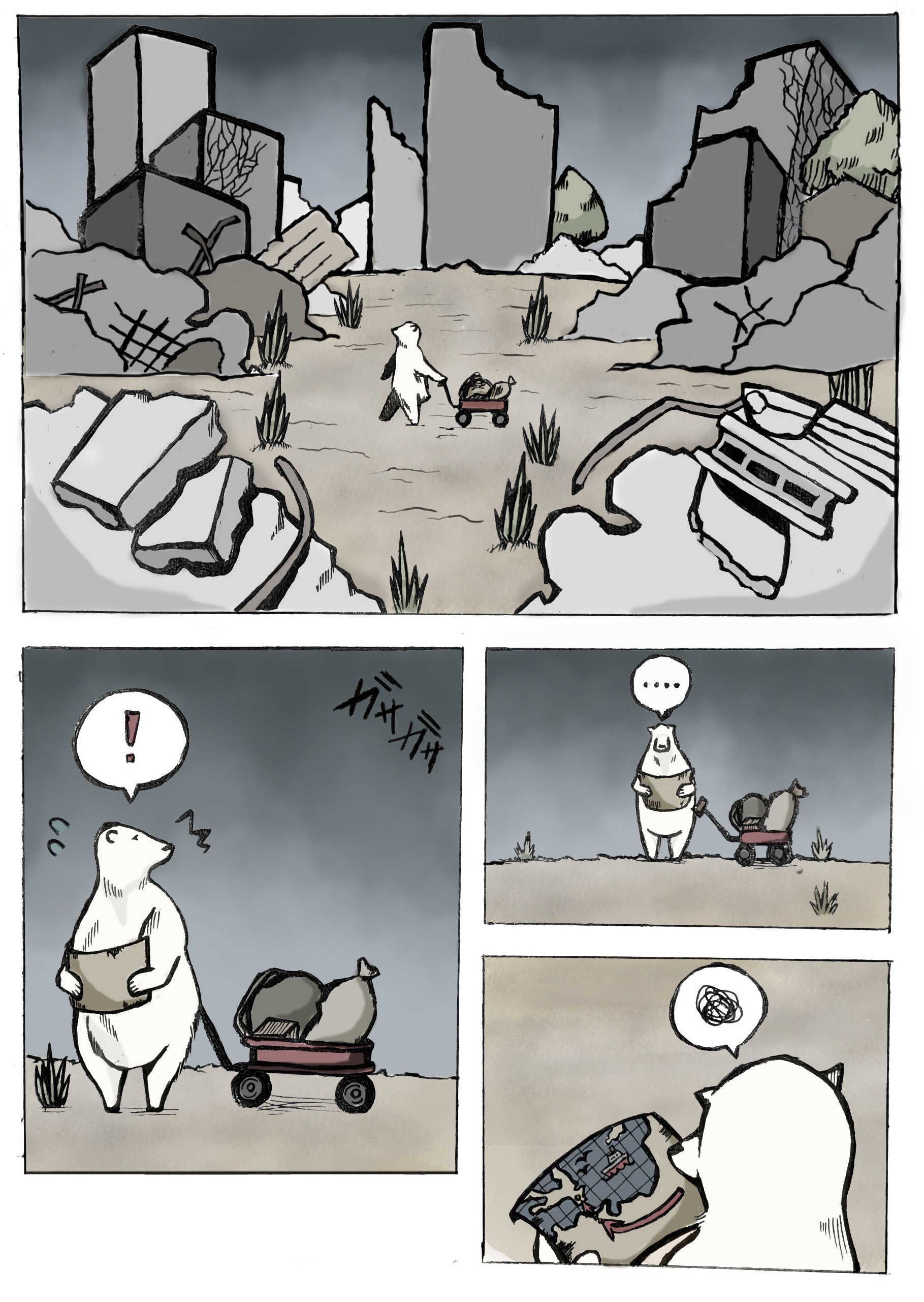 大まかに言うと荒廃した終末世界をシロクマが旅する物語です。