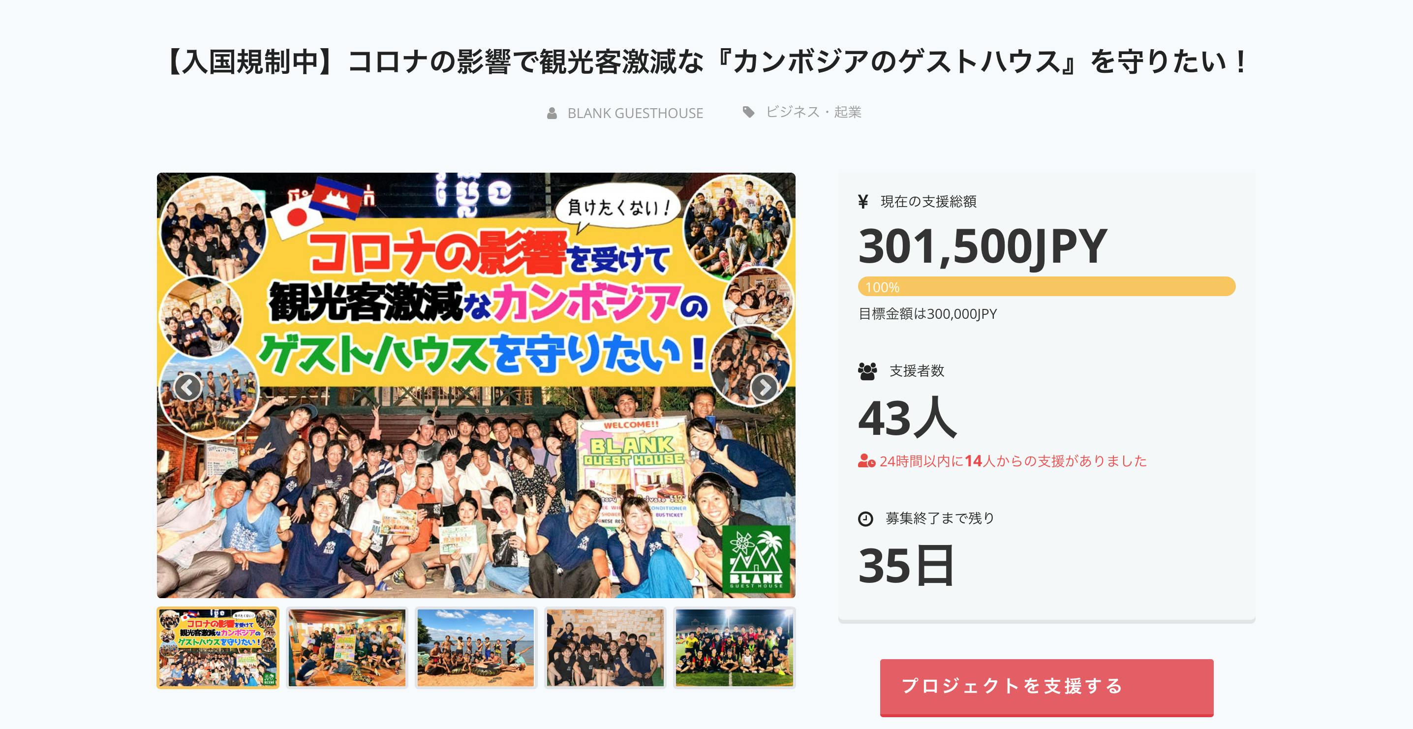 2020/05/23 10:33お久しぶりです!皆さまいかがお過ごしでしょうか?5月16日をもちまして、BLANK GUESTHOUSEをコロナ終息後にもまたたくさんの旅人が集い、楽しめる価値のある場として残すために休業中の固定費を捻出しようとするクラウドファンディングが終了いたしました。クラウドファンディングの結果としてNEXTゴールも達成し、累計90名の方から51万9500円をご支援していただきました!!ご支援していただいた皆様、本当にありがとうございました!4月10日夜にプロジェクトを公開。そこから、これまでBLANKに来てくださったゲストさんを始め、たくさんの方がクラウドファンディングに力を貸してくださいました。おかげで、翌朝には目標の50%を超え、勢いそのままに公開から48時間経たない日、当初の目標だった支援額30万円を達成することができました!!さらに『ビジネス・起業』カテゴリーの人気順が1位、『ゲストハウス』の検索で2位になるなど注目を集めるプロジェクトになりました!開始当初、目標金額30万円も達成できるのか不安だったのが率直なところ。こんなにも早く最初のゴールに手が届くとは思っていませんですた。多くの方のお力添えいただき、感謝の気持ちが溢れてなりませんでした。休業期間の固定費はこのクラウドファンディングと併せての副業によって工面する予定でした。4月の中頃になり、コロナウイルスの影響が世界的に深刻であることが明らかになり、当初想定していた夏再開に暗雲が立ち籠めるような状況になってきました。休業の長期化も考え、NEXTゴール50万円を設定して、休業を乗り越えるための挑戦を続けることとしました。そこからも少しづつご支援は集まり続け、 最後の2日間に再び20名を超える多くの方々に応援していただき、最終日にNEXTゴール支援金額50万円も達成することができました。ご支援と共に送っていただいたメッセージも全て読ませていただいております。これだけの金額をもって、これだけの人が応援してくださったことももちろんですが、その一つ一つに想いを載せていただいて本当に嬉しさと感謝の気持ちが溢れてなりません。4月11日にオープン1周年を迎えましたが、この1年間で「多くのから愛してもらえるゲストハウス」になることができたのだと強く感じました。 ご支援いただいた皆様へのクラファンリターンに関するご説明を含むお礼メール・は5/31に送信予定です。ただいま準備しておりますので、もう少々お待ちください!!これからもBLANK GUESTHOUSEは、たくさんの旅人にカンボジアやシェムリアップの魅力を伝えられる場所であり、旅の魅力を伝えられる場所であり、多くの人の出会いの場所であれるように邁進していきます。今回このプロジェクトを応援してくださった皆様に、カンボジア・シェムリアップでお会いできることを楽しみにしております!応援していただいた皆様、改めて、本当にありがとうございました!! もっと見る
