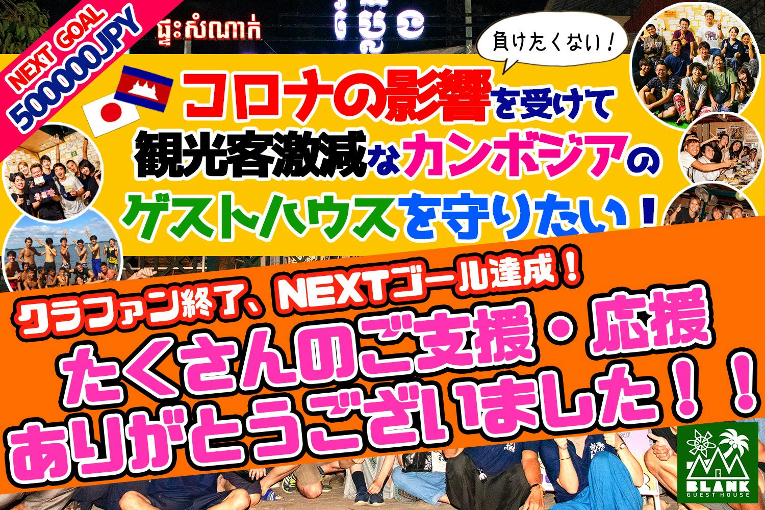 2020/04/13 18:14このクラウドファンディングを応援してくださっている皆さまご支援・拡散のご協力いただきました皆さまたまたまこのページをご覧になった皆さまこの度、皆さまのお力添えいただき、プロジェクト目標金額である30万円に到達し挑戦達成することができました!!公開から48時間が経たずしてのプロジェクト達成。公開後からたくさんの方に応援、ご支援いただき、予想をはるかに上回るスピードで達成を迎えることができました。「ゲストハウス」の検索内やビジネス・企業部門で人気順1位の獲得などもあり、嬉しい限りです。ご支援や拡散などの協力をしてくださいました皆さまのおかげでございます。心より御礼申し上げます。また最初に設定した目標金額を達成したことをうけ、新たにNEXTゴールを設定いたしました。今後は支援金額「50万円」を目標にして挑戦を続けていきます!!休業期間中の固定費ですが、このクラウドファンディングと合わせて、オーナーである土屋も日本で仕事をして補填していく次第です。少しでもこの休業期間を安定して乗り切るために、NEXTゴールの達成を目指していきます。また、新規リターンも追加致しました!●2.000円【お得】日本食レストランIZAKAYA BLANKお食事券 20ドル分【満腹必至】 BLANK GUESTHOUSE内に併設されている日本食レストラン『IZAKAYA BLANK』にて20ドル(2200円相当)分の食事ができる券となります。丼ものからカレー各種、うどん、そば、定食などなど、豊富な日本食あり。詳しくはBLANKのHPよりメニューをご確認ください。●5.000円【超お得!】大人気BLANKイベント2回参加券+ドリンク1日飲み放題【生ビールあり】 BLANK GUESTHOUSEオリジナルでシェムリアップの観光だけじゃない楽しさを感じてもらえる各種イベントへのお得な参加チケットです!イベントに参加される日の中から1日は生ビール・スプライト等ドリンクが1日中飲み放題。なお、イベント開催については人数次第となることもあるので繁忙期でのご利用を考えられている方におすすめいたします。●10.000円【世界遺産】シェムリアップ観光地ツアー満喫パック【大人気ツアー】 こちらはシェムリアップの大人気観光地を満喫できるツアーパックとなります。定番の世界遺産『アンコールワット遺跡群』はもちろん、天空の城ラピュタのモデルになったとも言われている『ベンメリア遺跡』、さらに東南アジア最大の湖『トンレサップ湖』での夕日鑑賞ツアーと、朝から晩までシェムリアップの観光地を満喫できます!!●10.000円【打倒コロナ】BLANKオーナーつっちとオンライン飲み会【ゲスト出演可】 BLANKのオーナーである土屋柊一郎とWEBにある各種アプリを用いて2時間オンライン飲み会しましょう!一輪車世界一周の話や旅の話、海外移住、海外起業、これからの話、考えなどなど話せますよ〜。なお、こちらはサシ(1対1)でもオンライン飲み会にゲストとして参加することも可能です。おうち時間な今、人気なオンライン飲み会でぜひ楽しみましょう!●20.000円【超レア会】BLANKオーナーつっちとサシ飲み+クラファン限定沈没パーカー【今回限定】 BLANKのオーナーである土屋柊一郎と2時間のサシ飲みができる権利です。東京都内(山手線沿い付近)またはカンボジア・シェムリアップにてつっちと2時間サシ(1対1)で飲むことができます。土屋が利用する分の交通費・飲食費のあなたへの負担はなし。さらに、今回のクラウドファンディング支援者様限定で激レア必至の『クラファン支援者様限定BLANKオリジナルパーカー』を制作&提供します!各リターンの詳細は、プロジェクトページをご覧ください。もちろん、全てのリターンには、『お礼メール+BLANK施設内にお名前掲載』も含まれますよ!!もう少し、BLANK GUESTHOUSEにお力をお貸しください。今後とも応援よろしくお願いいたします!! もっと見る