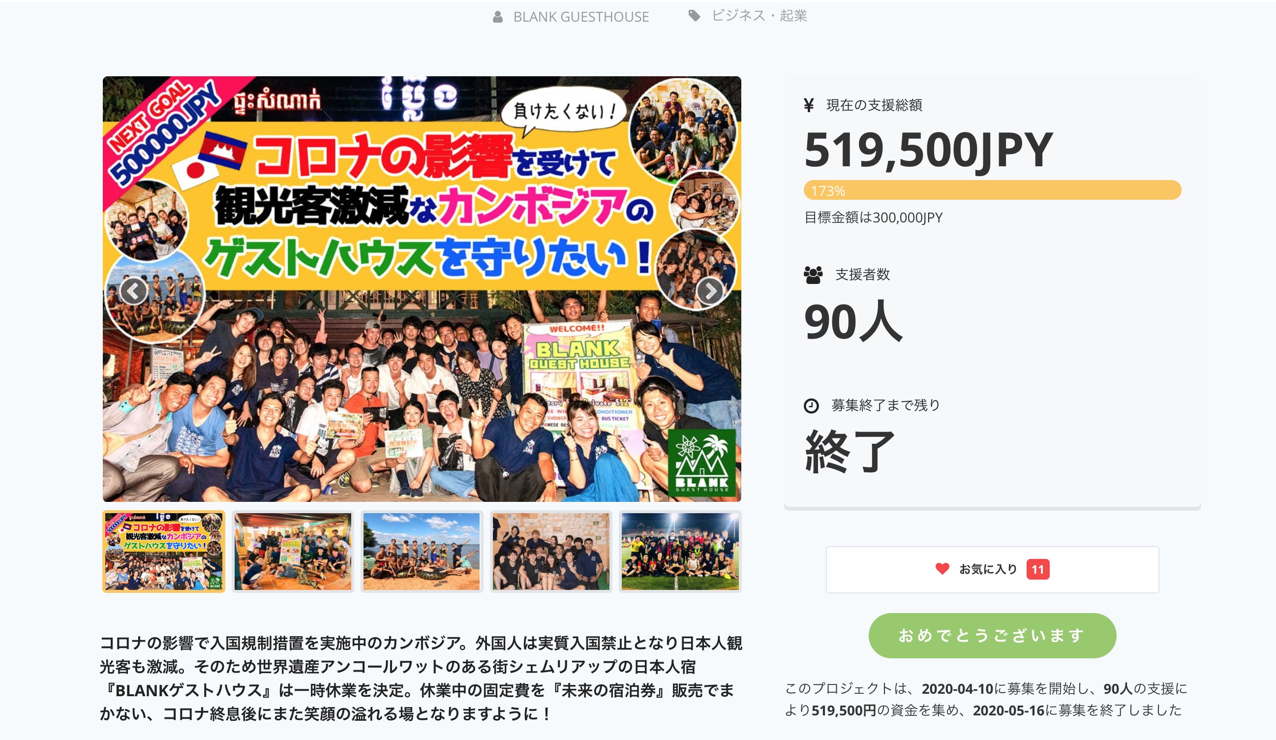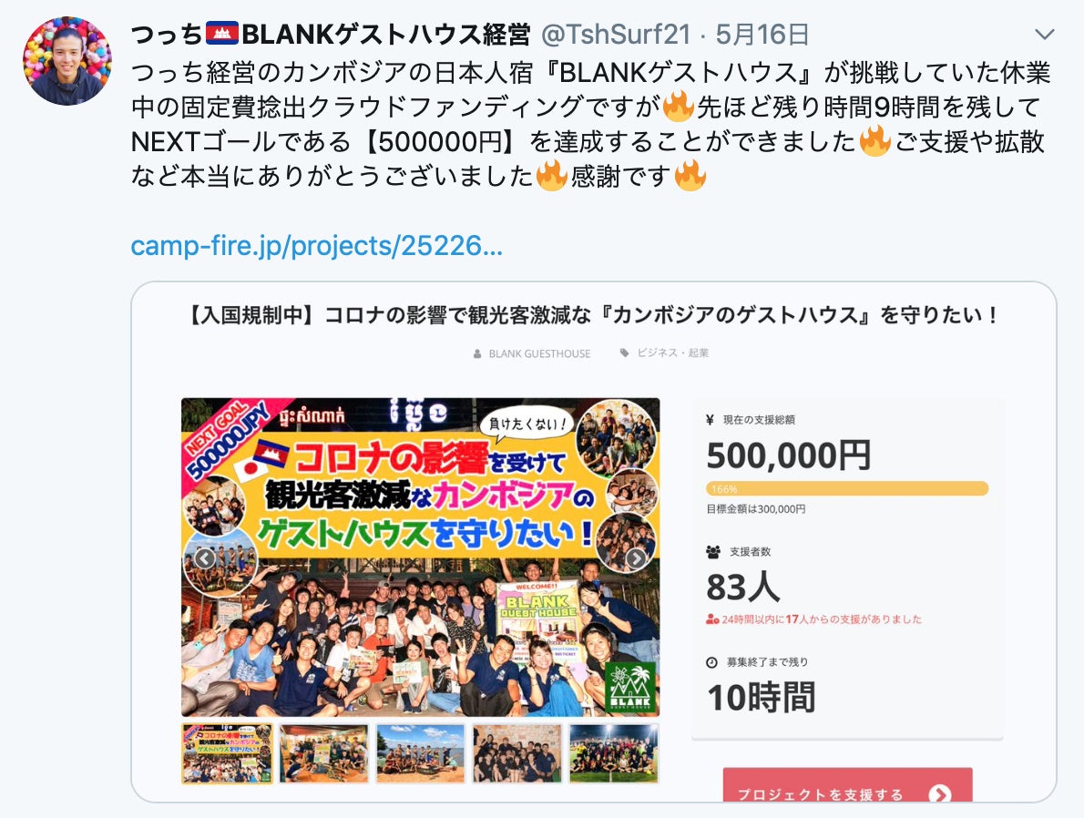 5月16日をもちまして、BLANK GUESTHOUSEをコロナ終息後にもまたたくさんの旅人が集い、楽しめる価値のある場として残すために休業中の固定費を捻出しようとするクラウドファンディングが終了いたしました。