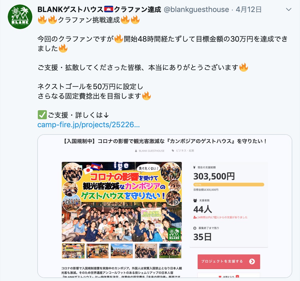 4月10日夜にプロジェクトを公開。そこから、これまでBLANKに来てくださったゲストさんを始め、たくさんの方がクラウドファンディングに力を貸してくださいました。おかげで、翌朝には目標の50%を超え、勢いそのままに公開から48時間経たない日、当初の目標だった支援額30万円を達成することができました!!さらに『ビジネス・起業』カテゴリーの人気順が1位、『ゲストハウス』の検索で2位になるなど注目を集めるプロジェクトになりました!