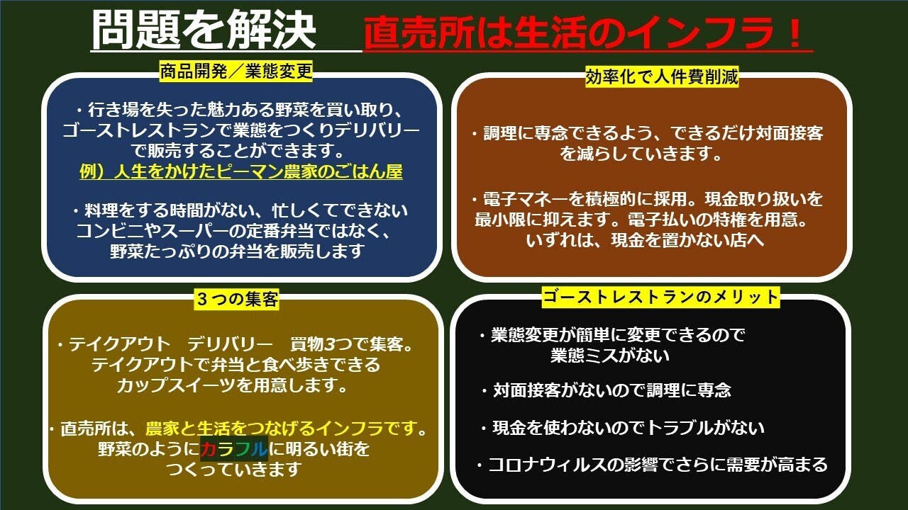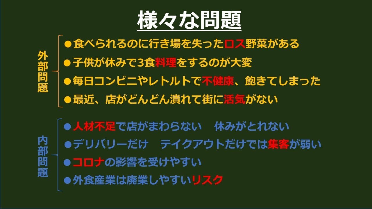 →通常の飲食店であれば1店舗1業種で売れなければ店をクローズさせなければいけないリスクを減らせます。なぜならオンライン販売の為、看板や店をつくり替える必要がないからです。行き場を失った野菜ピーマンがあるとするならピーマン料理を商品開発し業態をつくりオンラインで販売が可能です。