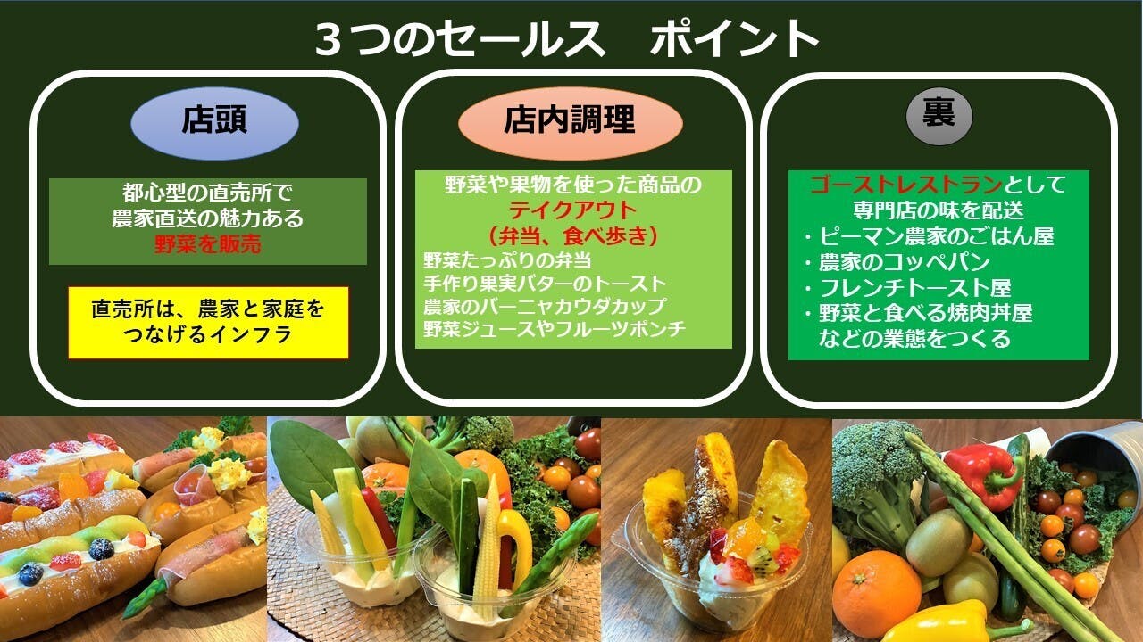 例)ピーマン農家のごはん屋という業態でピーマン肉詰め弁当、ピーマンカレー、ピーマンおにぎりなど農家ならではの食べ方やストーリーを添え販売することで魅力が増します。野菜であれば店とリンクできる為、店内でも単品販売が可能となります。